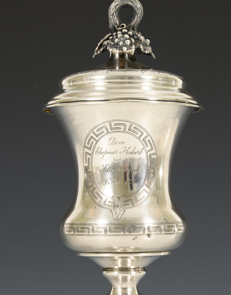 Mit zahlreichen Gravuren "zur Silberhochzeit" verzierter Pokal, plastischer Deckelknauf mit Weinlaub. Standfläche jünger mit Leder beklebt, einige Dellen.