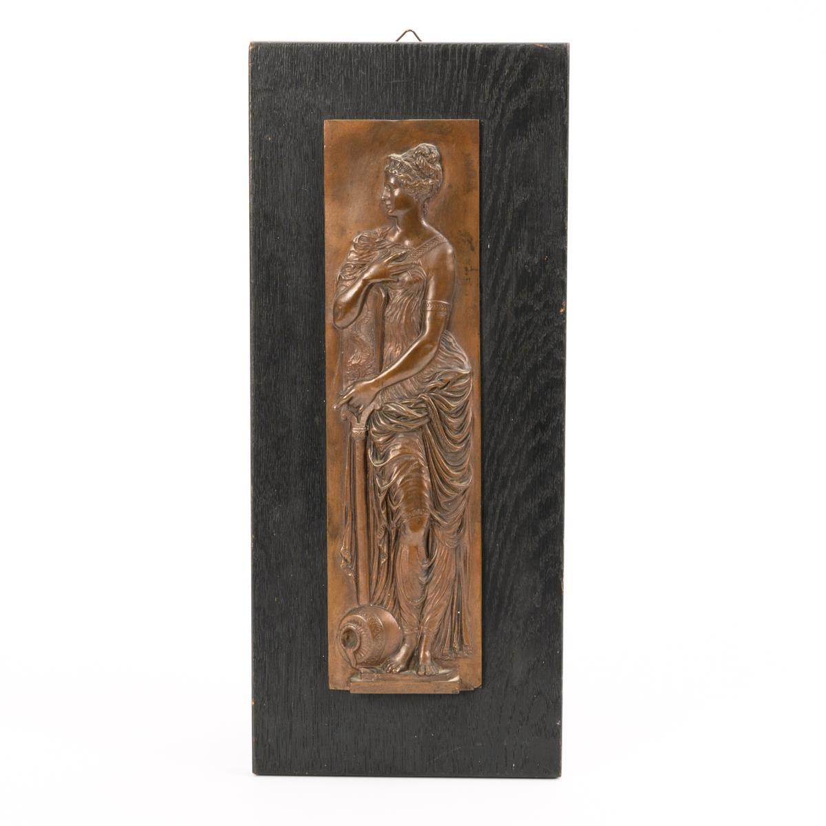 Bronze rotbraun patiniert, original auf ebonisierter Eichentafel montiert. "F. Barbedienne" bezeichnet. 28,5 x 7,5 cm, Tafel 37 x 16 cm.