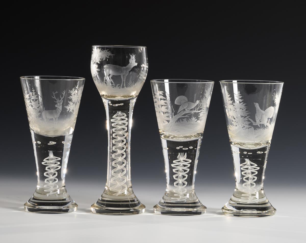 3x mit konischer und 1x mit bauchiger Kuppa, mit einem eingestochenen Luftblasenkranz am Kuppaboden, weißem Spiralfaden im Schaft und Rundfuß. Auf der Kuppa gravierte Jagdmotive.