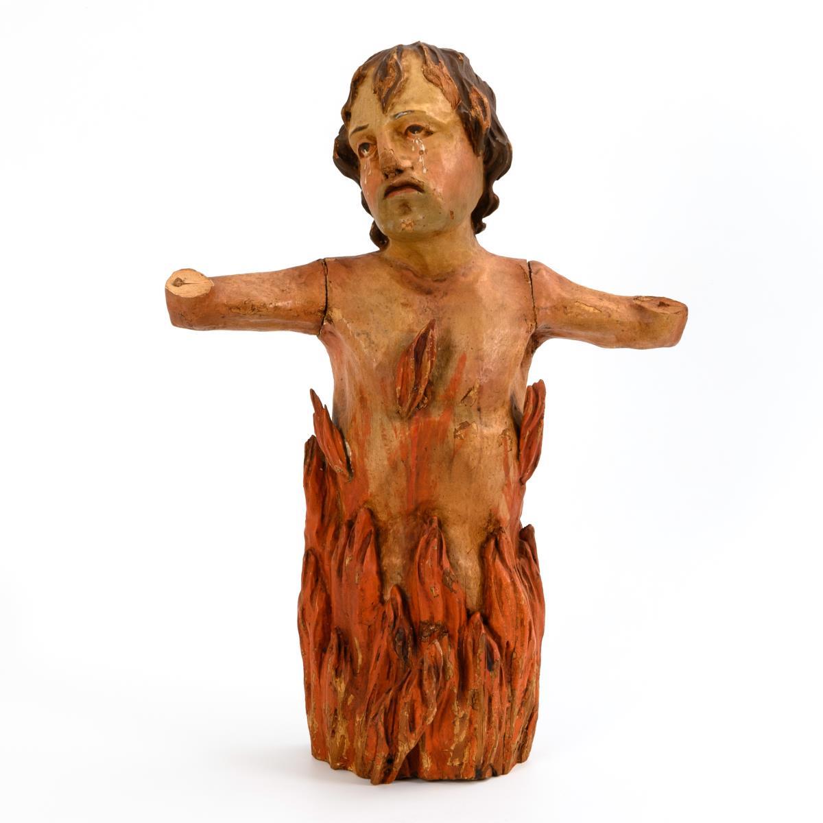 Halbfigur eines Mannes in den Flammen des Fegefeuers. Gelockerte Schulter-Leimfugen, Unterarme fehlen, Alters-/Gebrauchsspuren mit Schäden an der Fassung.