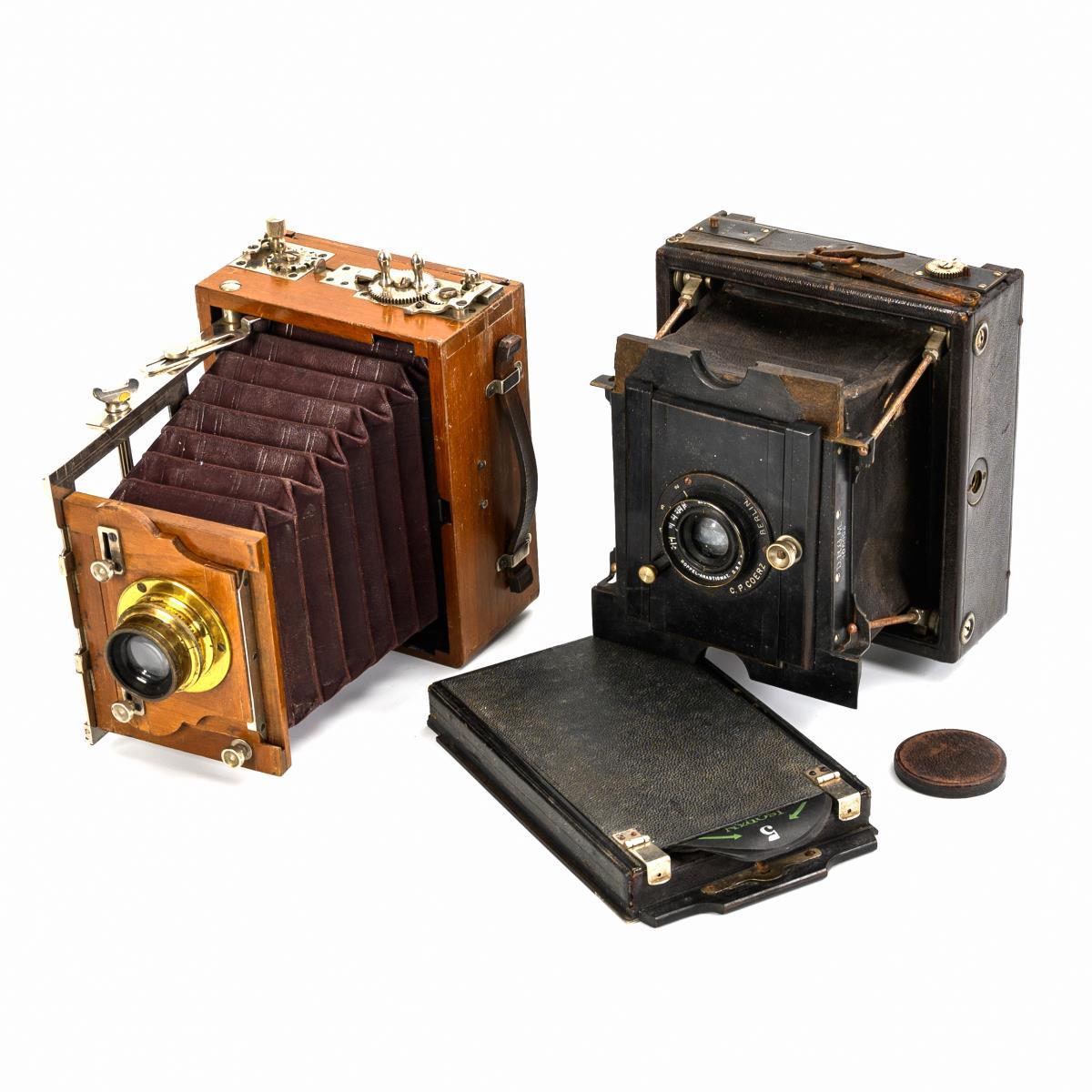Kamera im Holzkasten (Teak?) am Messingobjektiv "C. P. Goerz Berlin" gemarkt. (Glasscheibe fehlt.) / Lederbezogener Kasten mit ebonisierter Holzfront "AD. Fischl Jr" gemarkt, Objektiv "C. P. Goerz Berlin" gemarkt. (Rolloführung defekt, Fehlstellen am Holz.) / Kassette mit herausziehbarer Aluminium-Scheibe "Aqua Filmpack" "Isopan Super Spezial". Je Alters-/Gebrauchsspuren.
