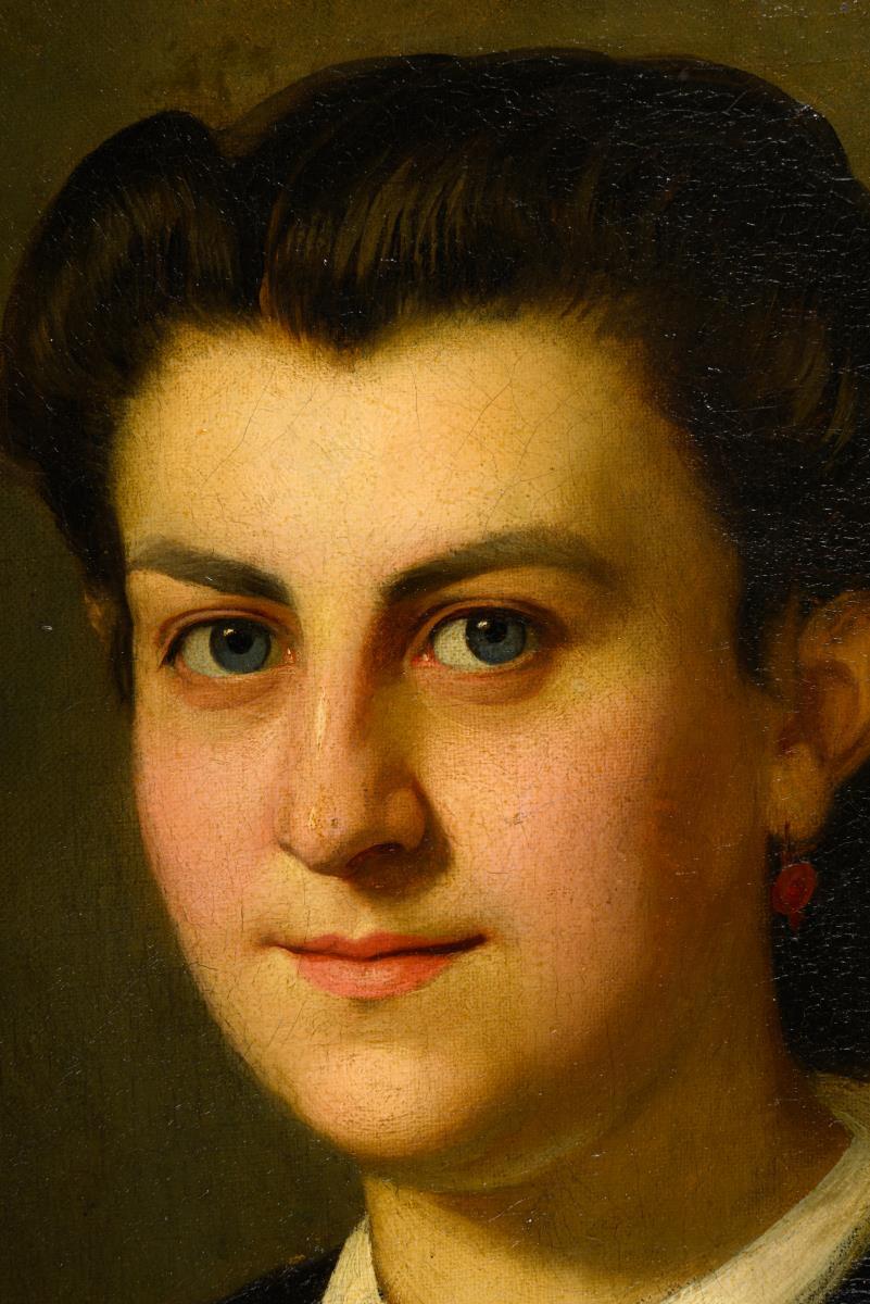 Porträt einer jungen Frau im schwarzen Kleid mit hochgestecktem Haar und roter Brosche. Altersspuren.