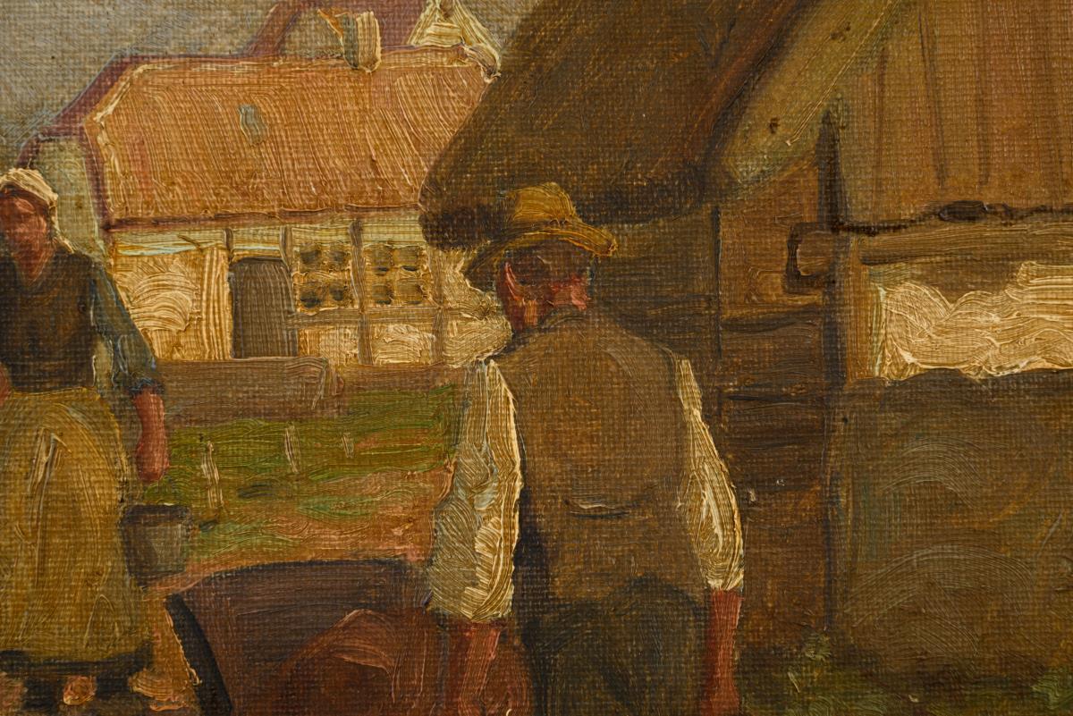 Das Paar vor dem Haus nahe dem Boot im Sonnenschein. Eine kleine restaurierte Stelle mit Hinterklebung.