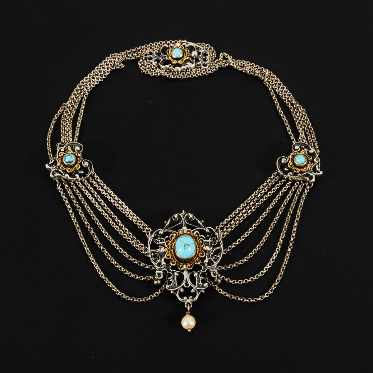 Trachtencollier mit Türkisen und Zuchtperle.
