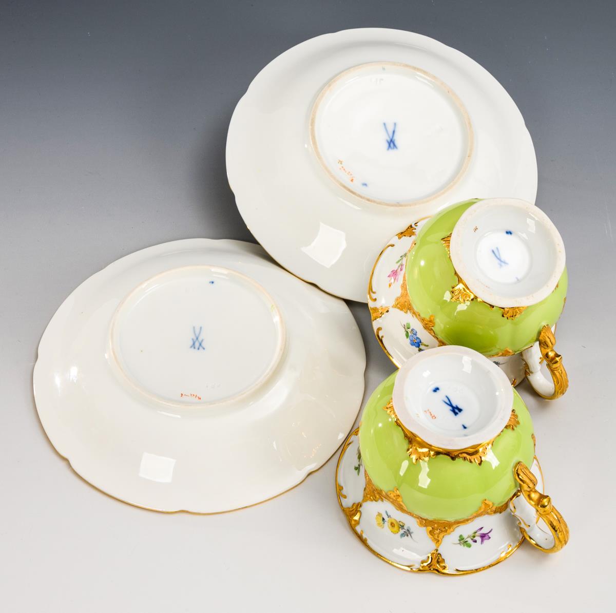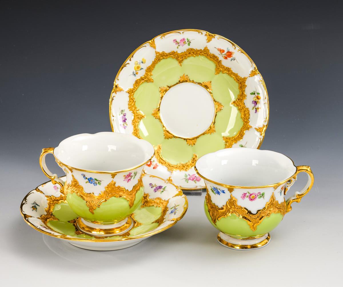 4 Teile. 2 Kaffeetassen und 2 Untertassen mit hellgrünem Teilfond, polychromer Streublümchenmalerei und Goldbronzierung. Haarriss in 1 Henkel.