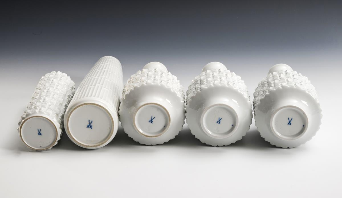 5 weiße Vasen. Meissen.