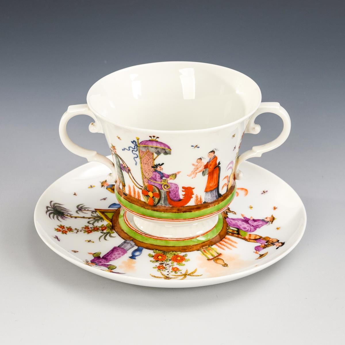 Kraterbecher mit zwei Rocaillehenkeln. Auf Tasse und Untertasse die Darstellung einer blühenden Gartenlandschaft mit Chinesenfiguren, verschiedenen Tätigkeiten nachgehend. Malerei in Anlehnung an die Meissener Höroldt-Chinoiserien. Minimaler Farbabplatzer an der Tasse.
