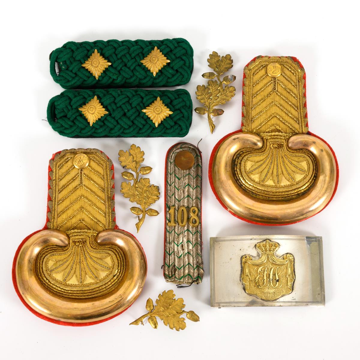 Epaulettenpaar mit Goldstickerei und sächsischem Wappen auf dem Knopf, Paar Schulterstücke, 3 Eichenlaub-Applikationen. Große Gürtelschnalle mit bekröntem Monogramm EI und CS (eventuell Sachsen-Coburg). Dazu ein Schulterstück des Schützen-(Füsilier-)Regiments „Prinz Georg“ (Königlich Sächsisches) Nr. 108.
