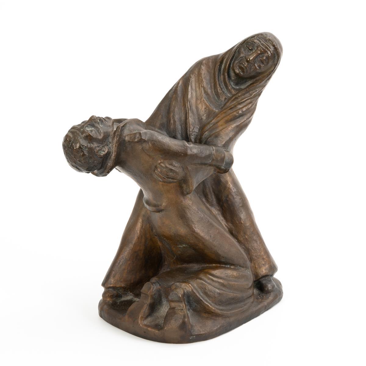 Dynamische Komposition, in der die Frau den in die Knie gegangenen Mann hält.