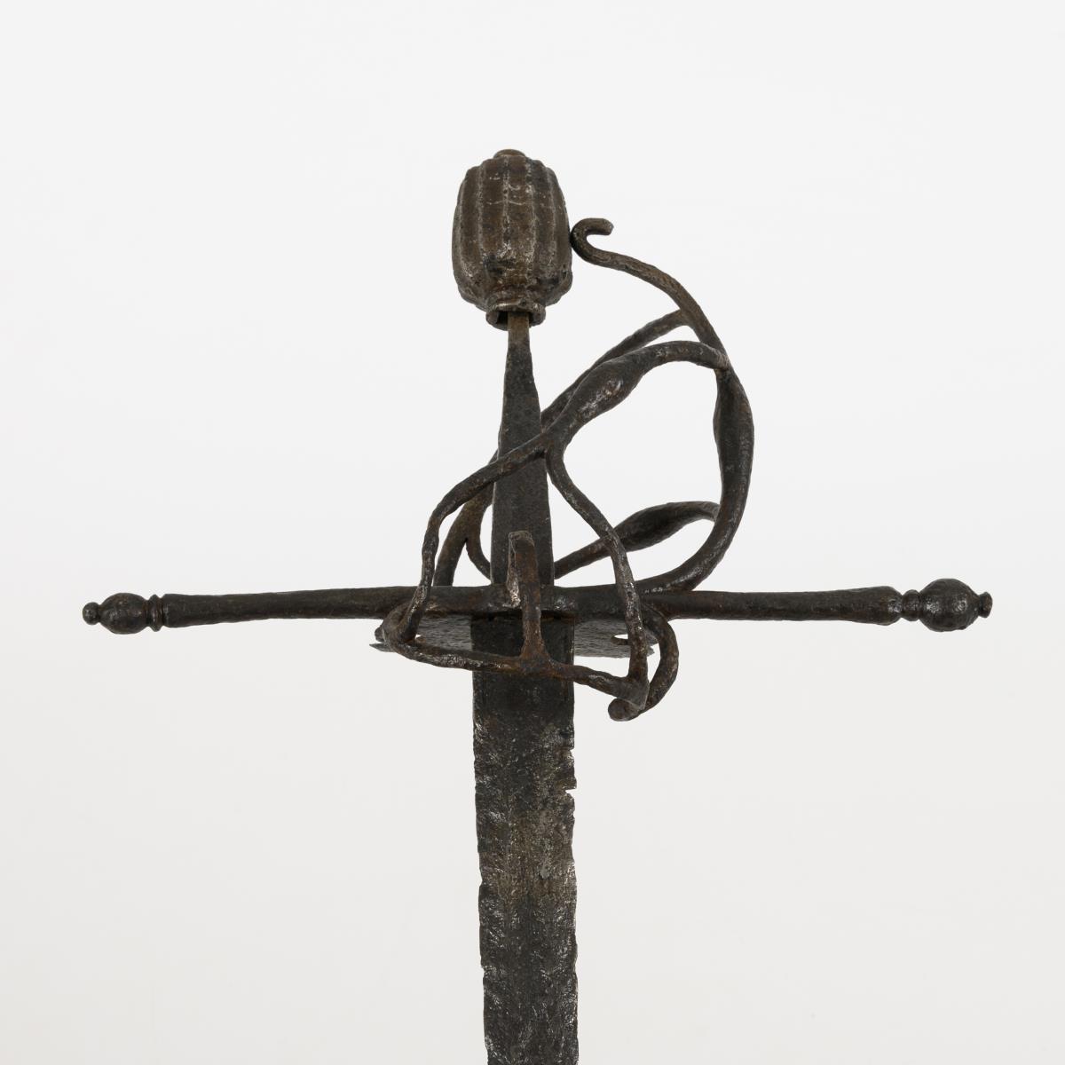 Gerade zweischneidige Klinge, mit Hohlschliff im unteren Viertel, Spangenkorb und ovaler, kannelierter Knauf. Holzfassung des Griffes fehlt, nur die Angel ist vorhanden. Wohl Bodenfund, konserviert, mit starken Korrosionsnarben..