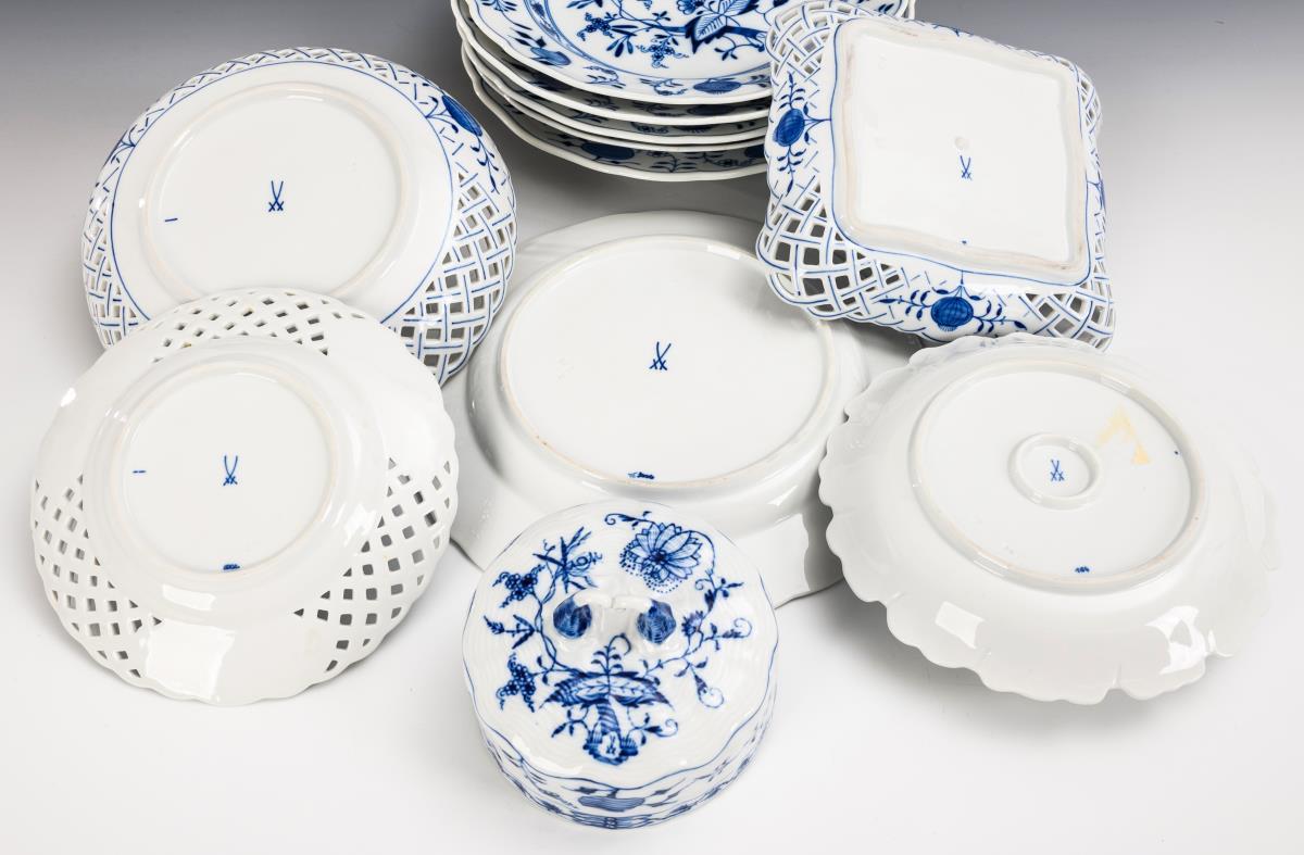 Form "Neuer Ausschnitt". 6 Speiseteller, 2 Durchbruchschalen (1x Ø 21 cm und 1x 18,5 x 18,5 cm), 1 Durchbruchteller (Ø 18 cm) und 1 runde Butterdose (Ø 19 cm).