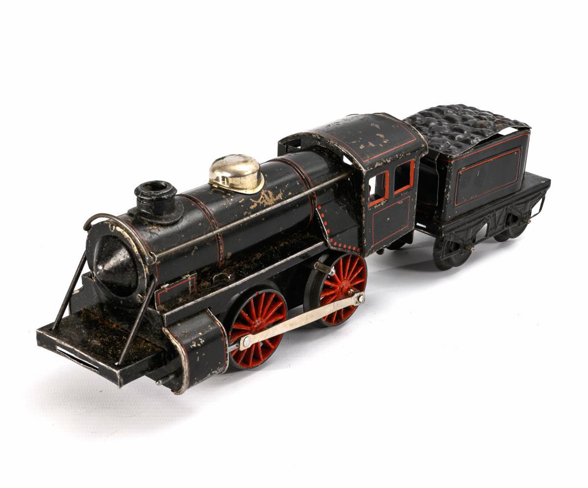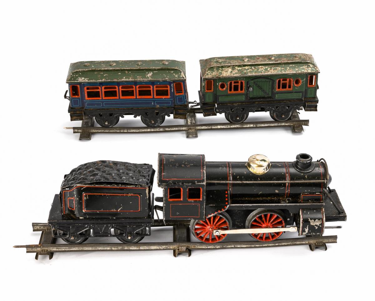 Schwarze Bub-Lok mit intaktem Uhrwerk (L 21 cm), passender Tender (L 12 cm), 2 Waggons (L 17,5 cm), Eisenbahnbrücke und Konvolut Weißblech-Schienen. 1 ergänzter Schlüssel anbei. Bespielt, mit starken Defekten.