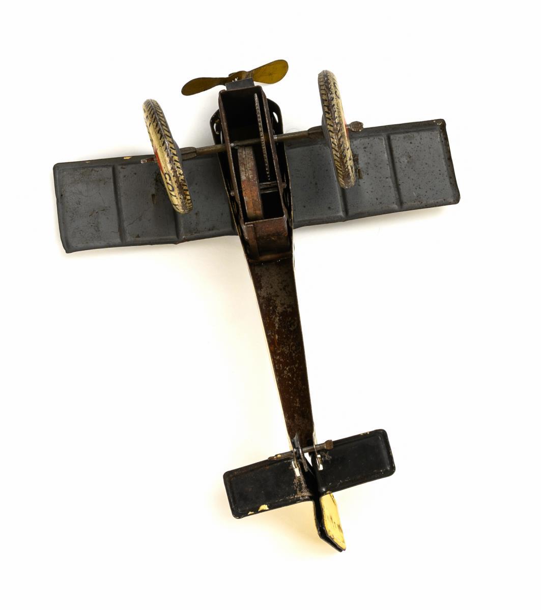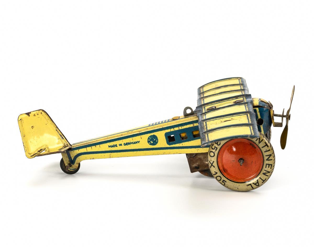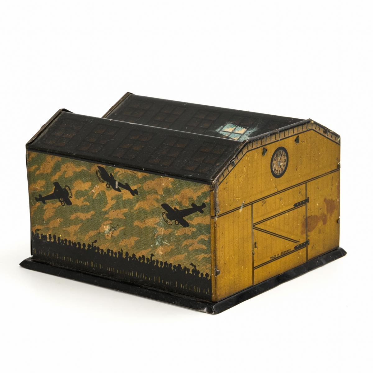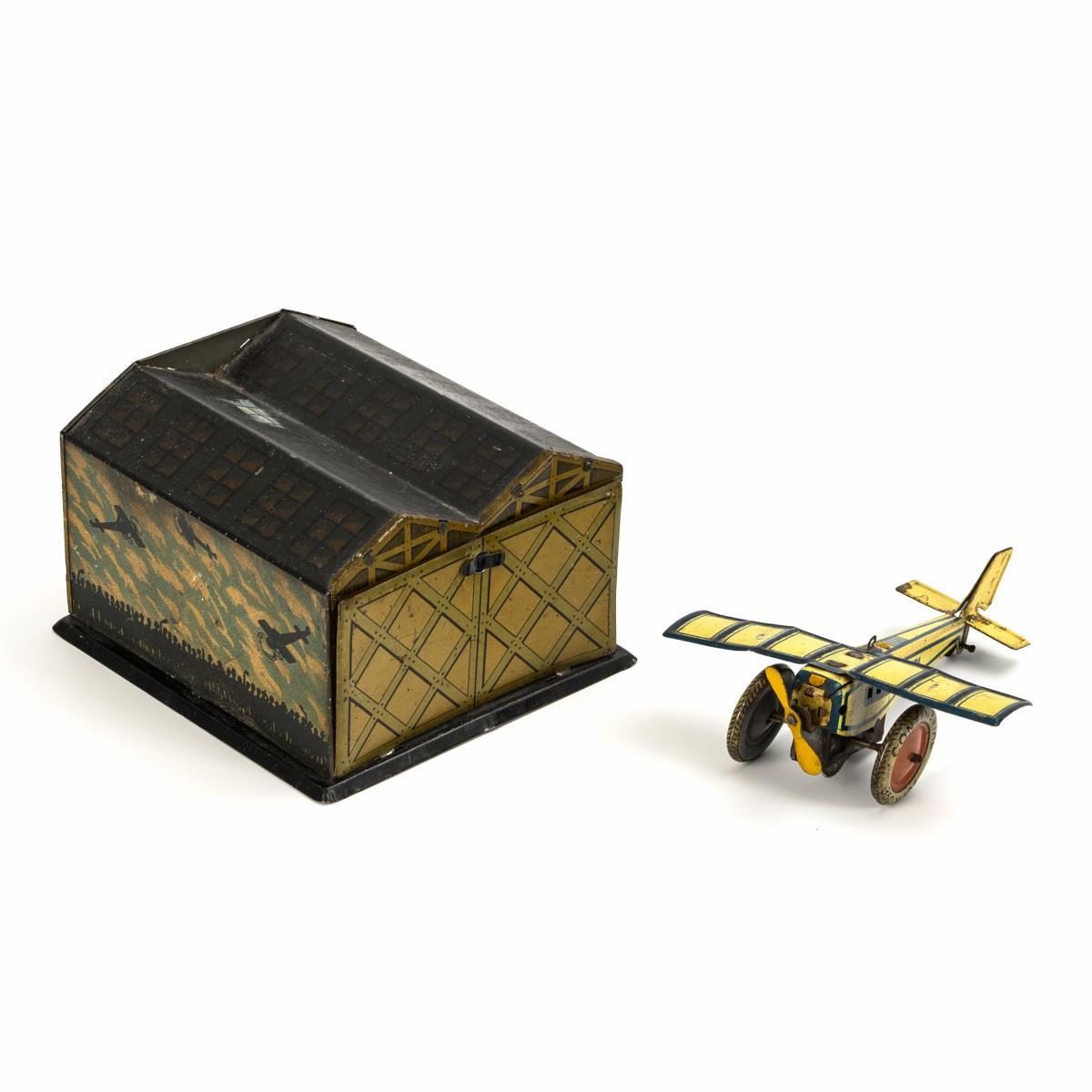 Kleine Distler-Propellermaschine "574", L 13 cm. / Hangar mit aufklappbarer Front, 8 x 12 x 13 cm. Altersspuren, kleine Defekte.