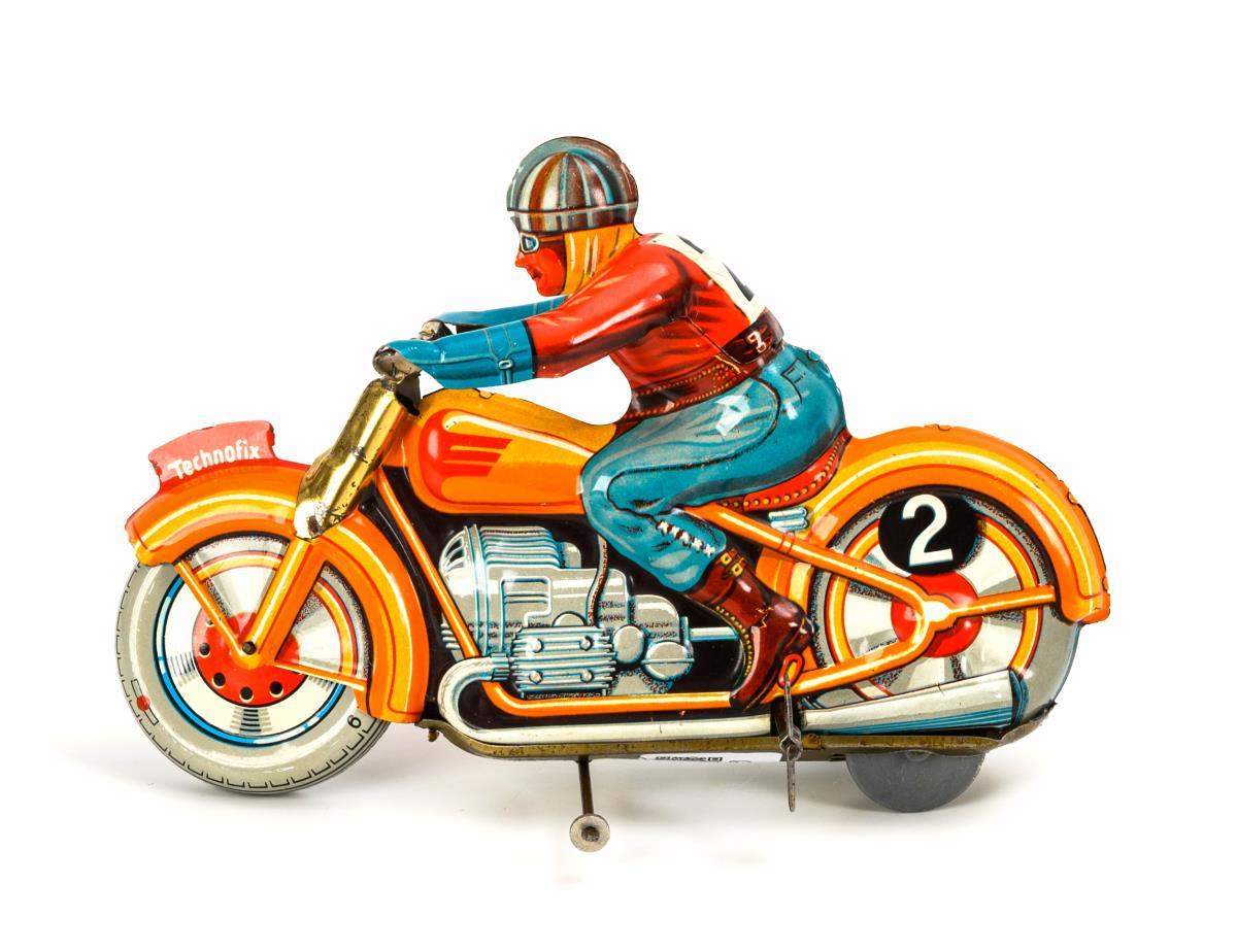 Spätere Ausführung des Motorrads "GE 255" mit Fahrer. Intaktes Werk mit festem Schlüssel. Kleine Lackdefekte.