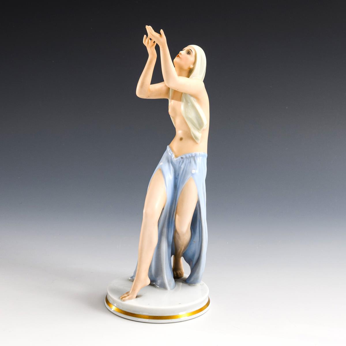 Orientalisch gekleidete Tänzerin in ausdrucksvoller Pose, die Hände erhebend, auf Rundplinthe.