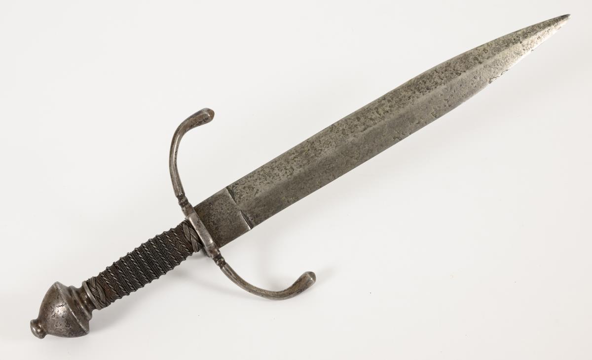 Breite zweischneidige Klinge mit Mittelgrat. Zur Klinge hin gebogene Parierstange und 'Parier-Ring'. Griff mit schöner Drahtwicklung und 'Türkenbund' (eventuell später ergänzt) und halbrunder Knauf aus Eisen. Klinge und Knauf mit konservierten Korrosionsnarben.