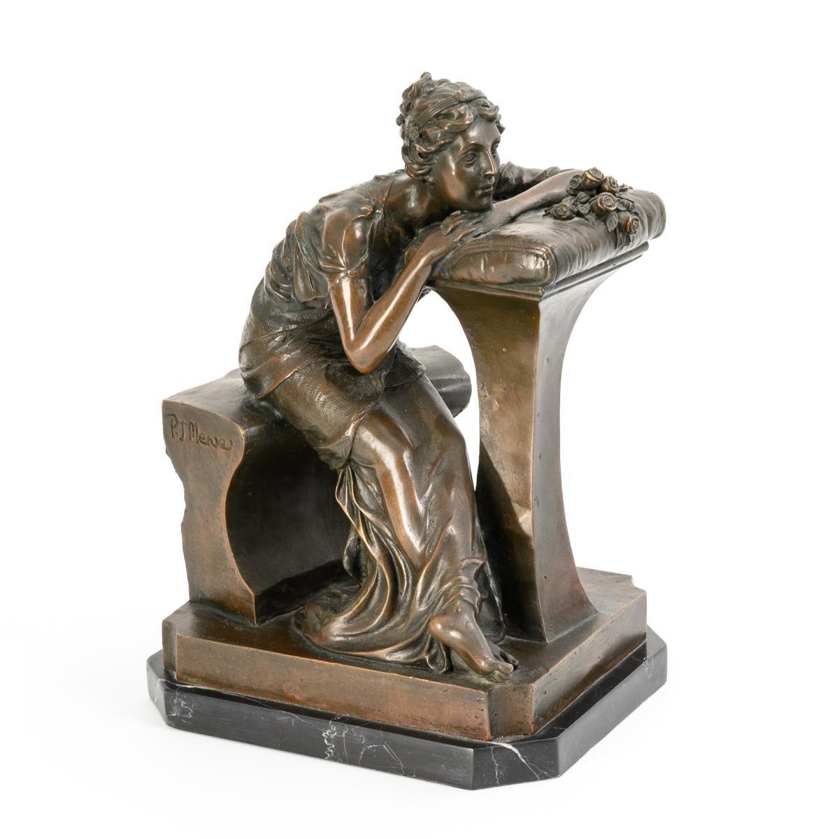 Nachguss der sitzenden Schönheit, die auf ein Kissen mit Rosen gelehnt träumt.