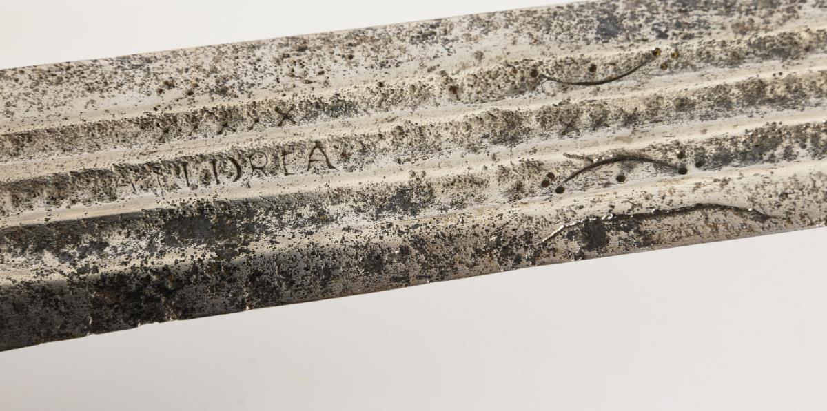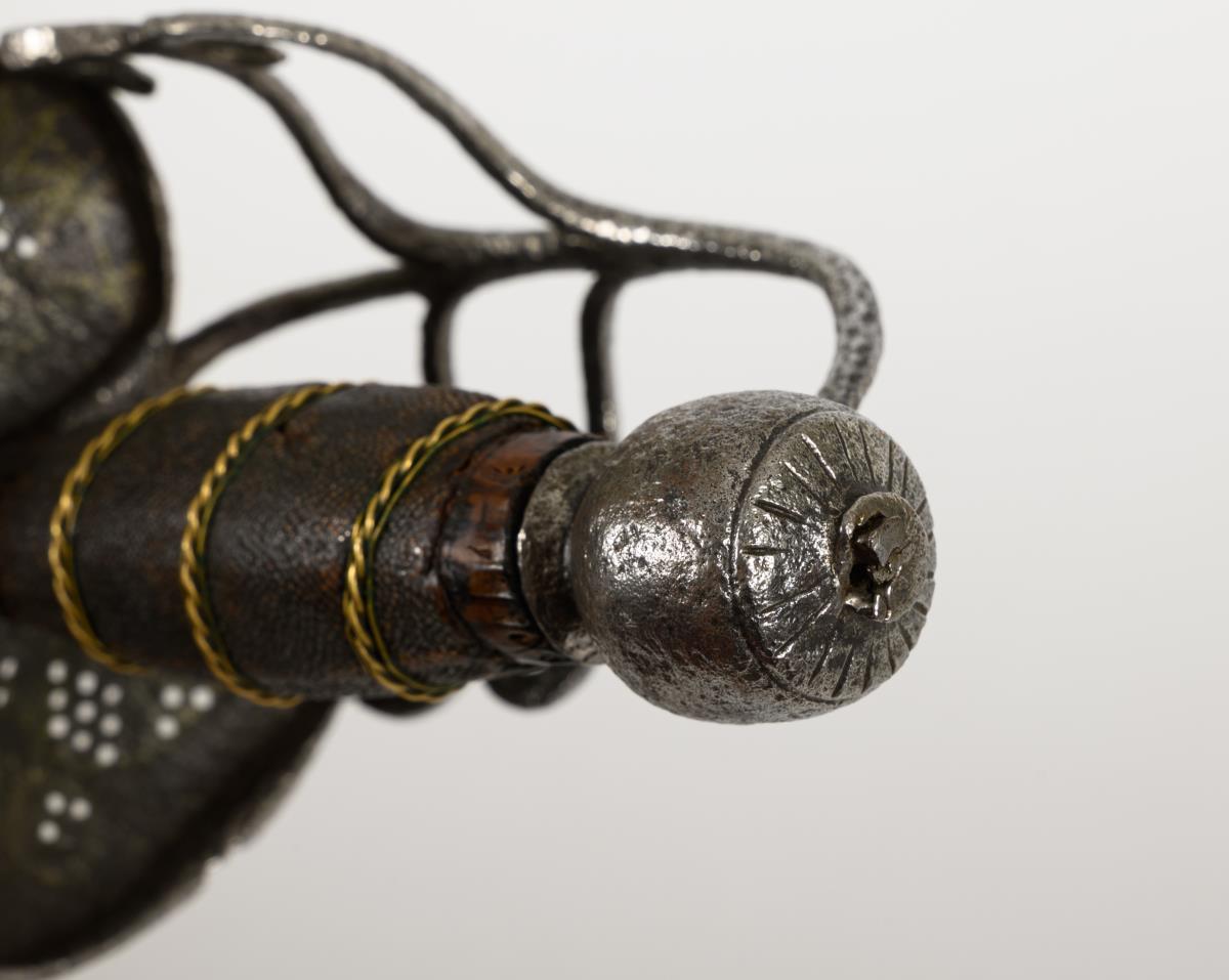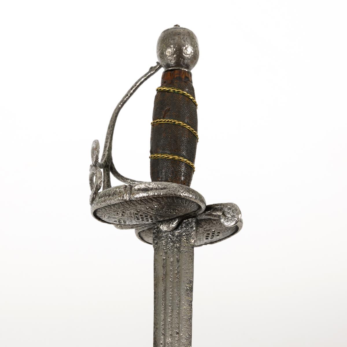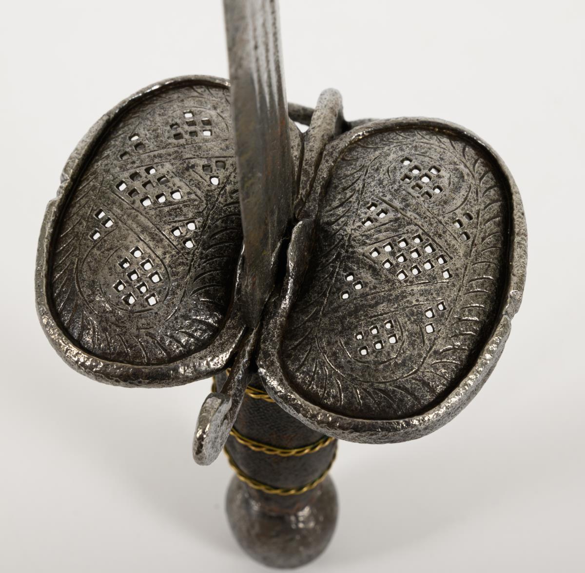 Breite, zweischneidige Klinge mit drei schmalen Hohlschliffen im unteren Viertel. Dort undeutliche Schriftzeichen "... TERARA". Eisengefäß mit nierenförmigem Stichblatt und Lochmusterung. Holzgriff mit Rochenhaut bezogen (Fehlstellen) und Drahtwicklung. Fast runder Knauf. Korrosionsnarben.