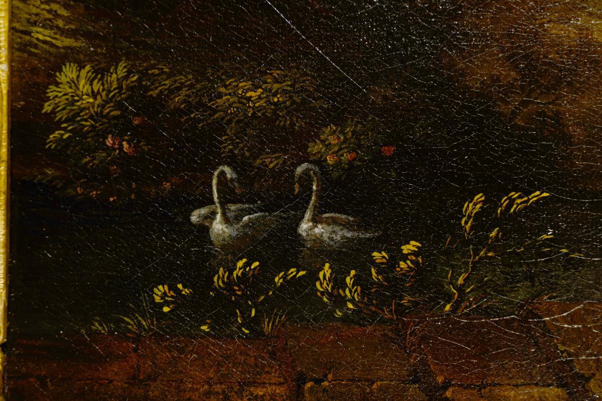 Das Paar an einer Rune mit Schwänen im Wasser unweit einer Küstenstadt. Leinwand doubliert.