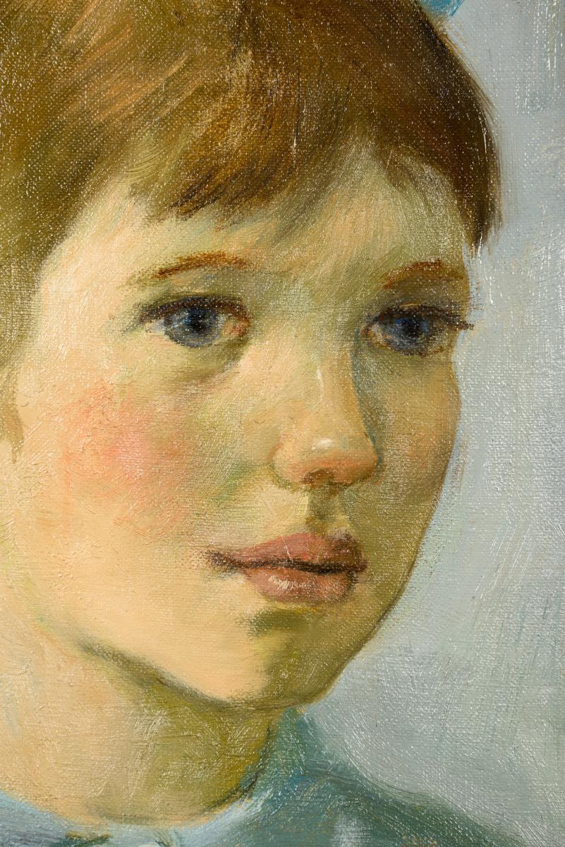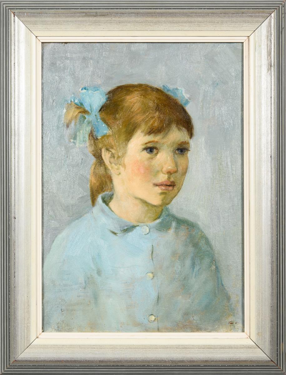 Bildnis eines Mädchens mit blauen Schleifen im Haar vor neutralem Hintergrund.