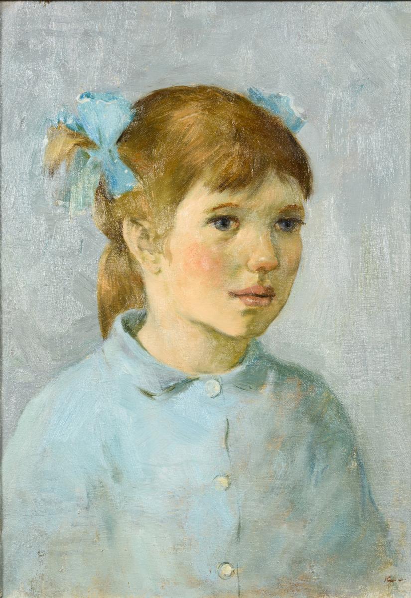 Bildnis eines Mädchens mit blauen Schleifen im Haar vor neutralem Hintergrund.