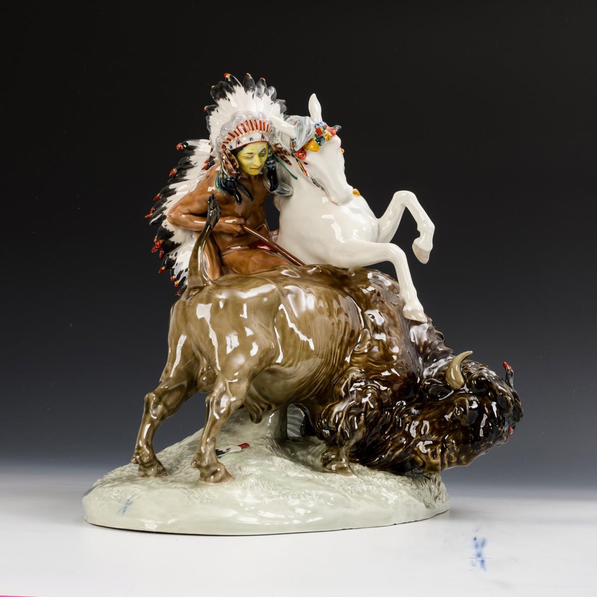 Auf einem Schimmel reitender, ein Bison jagender Indianer. Unterseitig Brandriss im Sockel (schauseitig restauriert), 1 Federspitze bestoßen, Federspitzen teils restauriert, auf dem Sockel liegende Feder restauriert.
