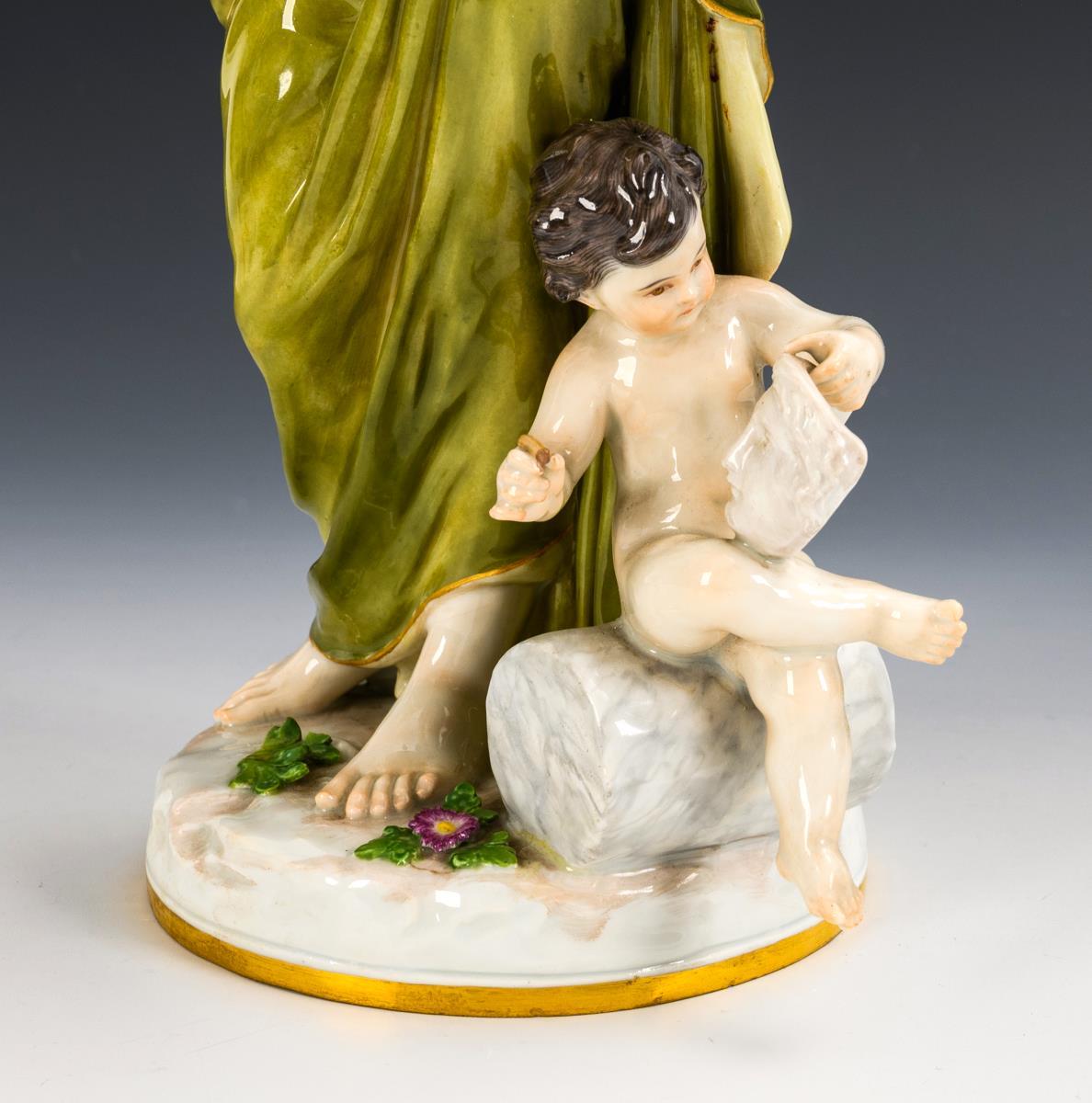 Auf einem Rundsockel stehende weibliche Allegorie der Malerei mit Pinsel und Palette, zu ihren Füßen ein Putto mit Maske sitzend. Alle Pinsel sowie 2 Blätter am Lorbeerhaarschmuck bestoßen.