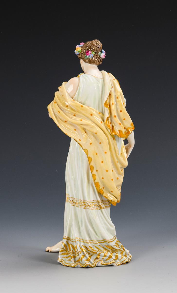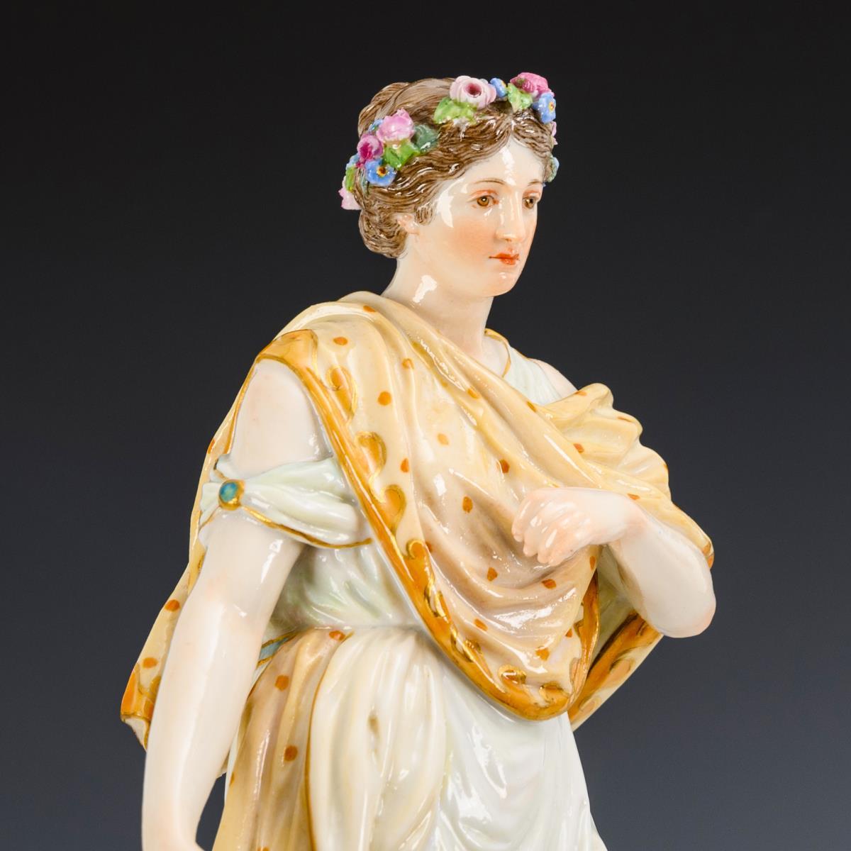Fein modellierte junge Frau im antiken Gewand mit Blütenkranz. Linker Fuß restauriert, Blütenkranz minimal bestoßen.