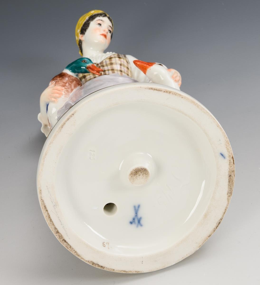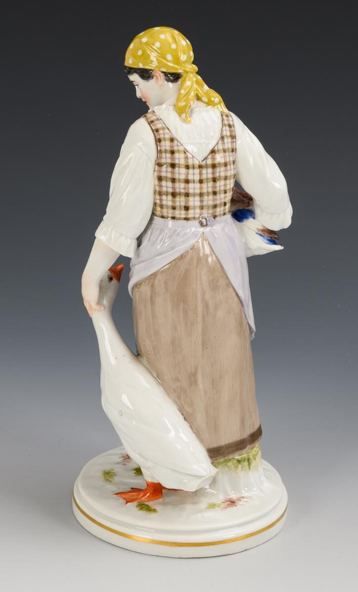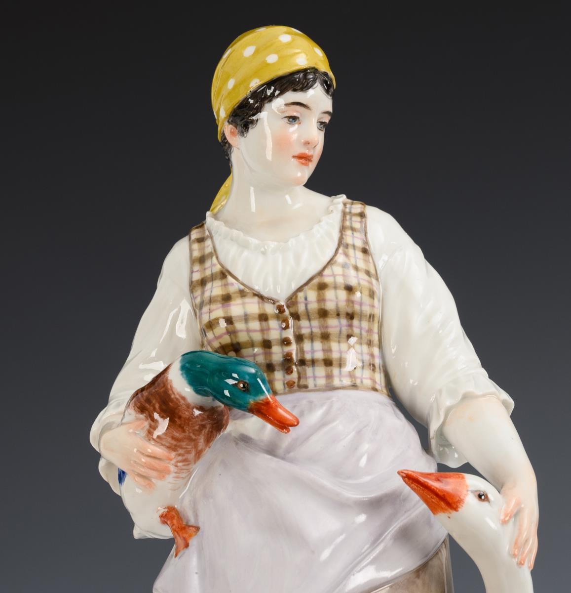 Junge Frau mit Gans und Ente. Gänseschwanz fehlt.