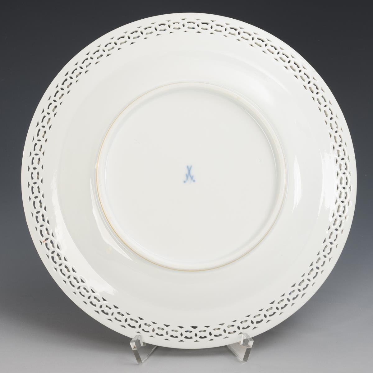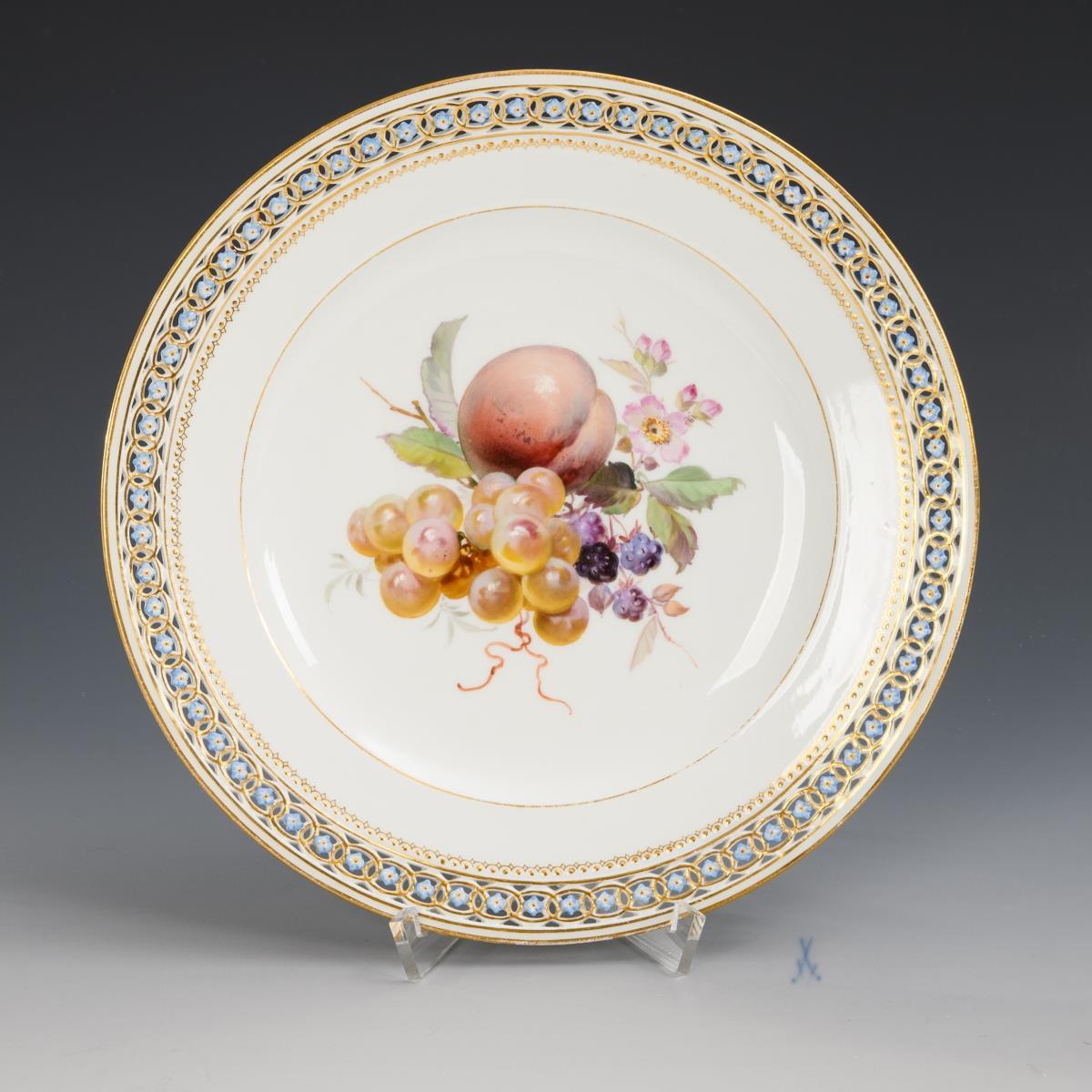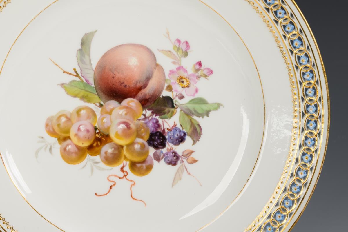 Teller mit durchbrochener Randbordüre, im Spiegel ein Fruchtbukett mit Pfirsich, Trauben und Brombeeren. Minimaler Goldabrieb am Rand.