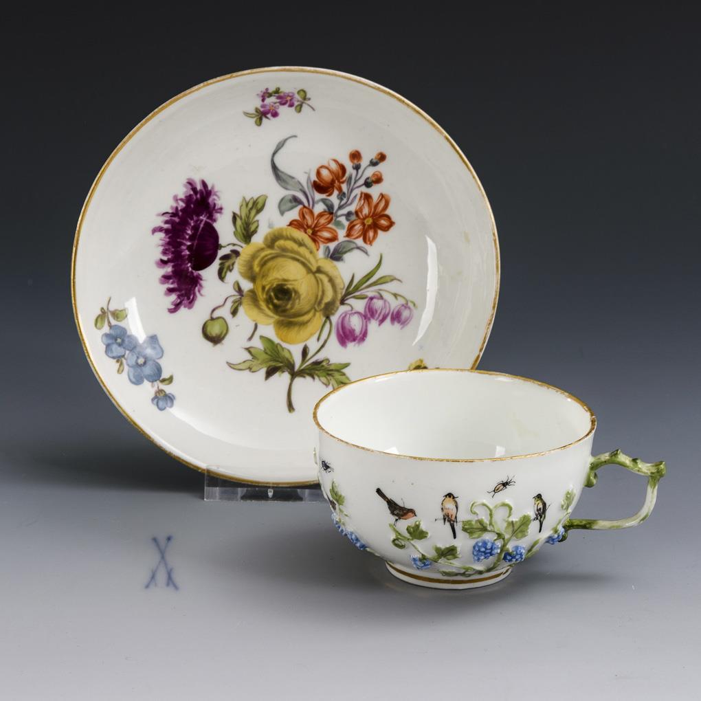 Bauchige Tasse mit spitz geschweiftem Henkel. Tasse und Untertasse mit Weinrankenrelief und Vogelmalerei auf der Wandung, im Spiegel der Untertasse Blumenmalerei. Unterer Henkelansatz restauriert, 1 restaurierte Bestoßung am Tassenrand, minimaler Goldabrieb.