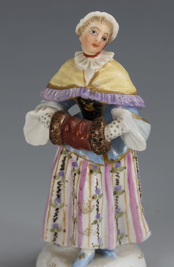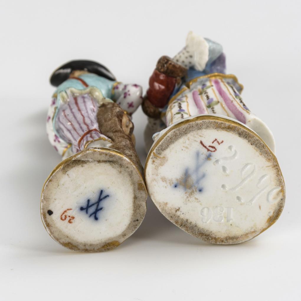 1x Modell-Nr. 2990, Entwurf 1750/60 von Johann Joachim Kaendler (1706-1775) und Peter Reinicke (1715-1768); Dame mit Muff. / 1x Modell-Nr. 2748, Entwurf 1760 von Johann Joachim Kaendler (1706-1775) und Mitarbeiter: Schäfer mit Brottasche. Minimaler Glasurabplatzer am Hut des Schäfers.