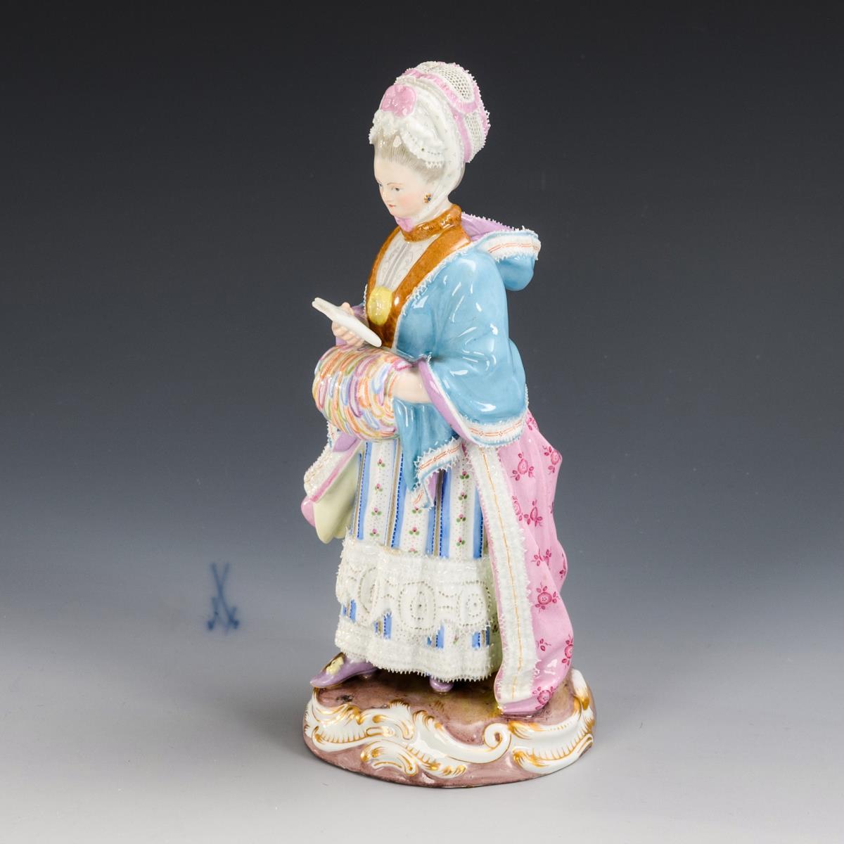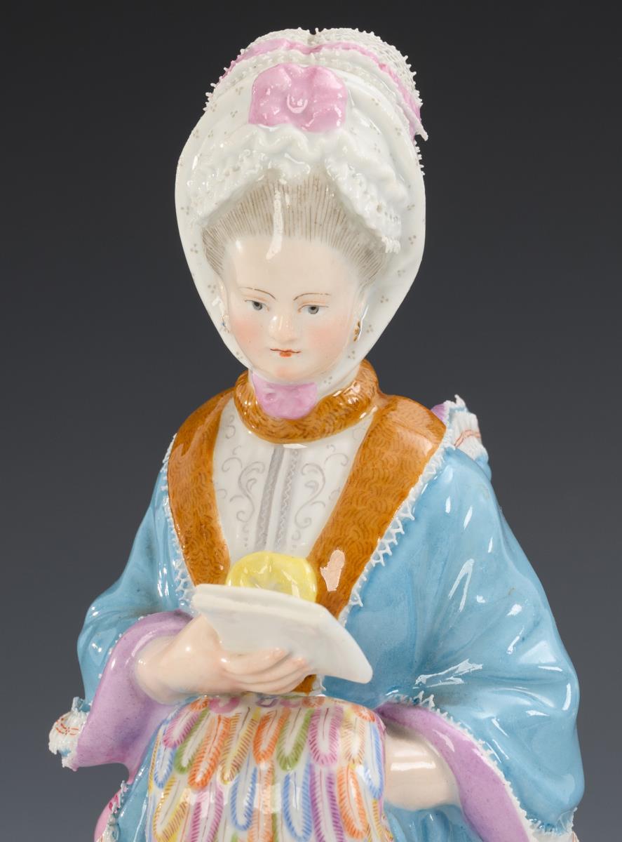 Auf einem Rocaille- und Terrainsockel stehende Dame in winterlicher Kleidung, einen Brief lesend. Spitze minimal bestoßen.