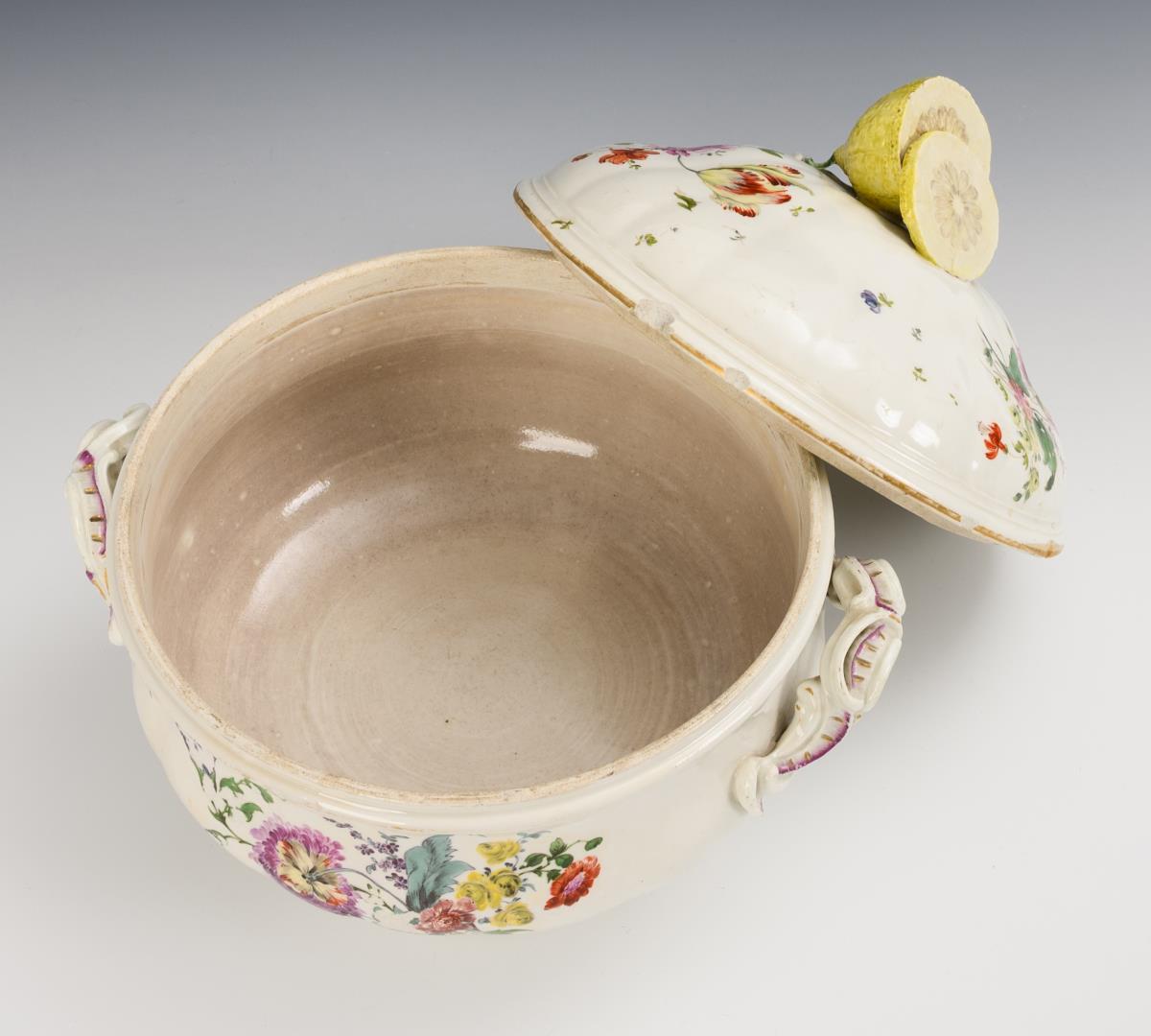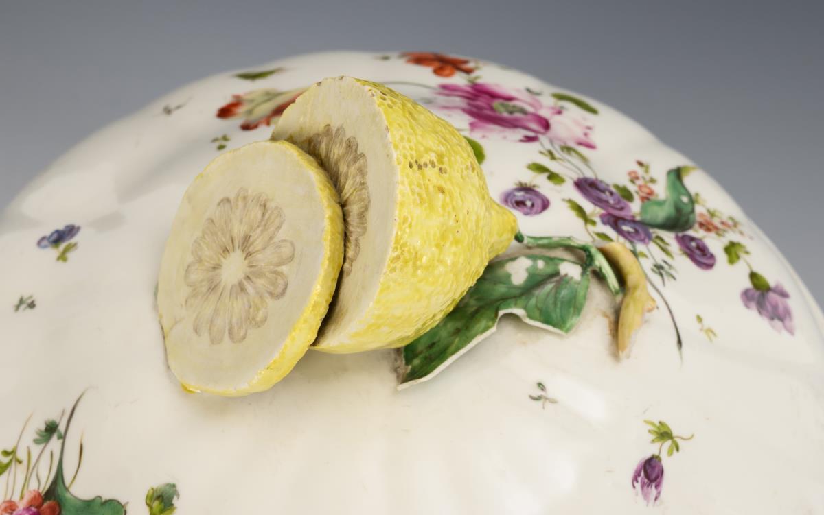 Runde Terrine mit zwei Rocaillehandhaben sowie einem Deckel mit einer aufgeschnittenen Zitrone als Knauf. Gold berieben, partiell Farbabplatzer in der Malerei, Bestoßungen am Deckelrand, Zitronenblatt und -stiel bestoßen.