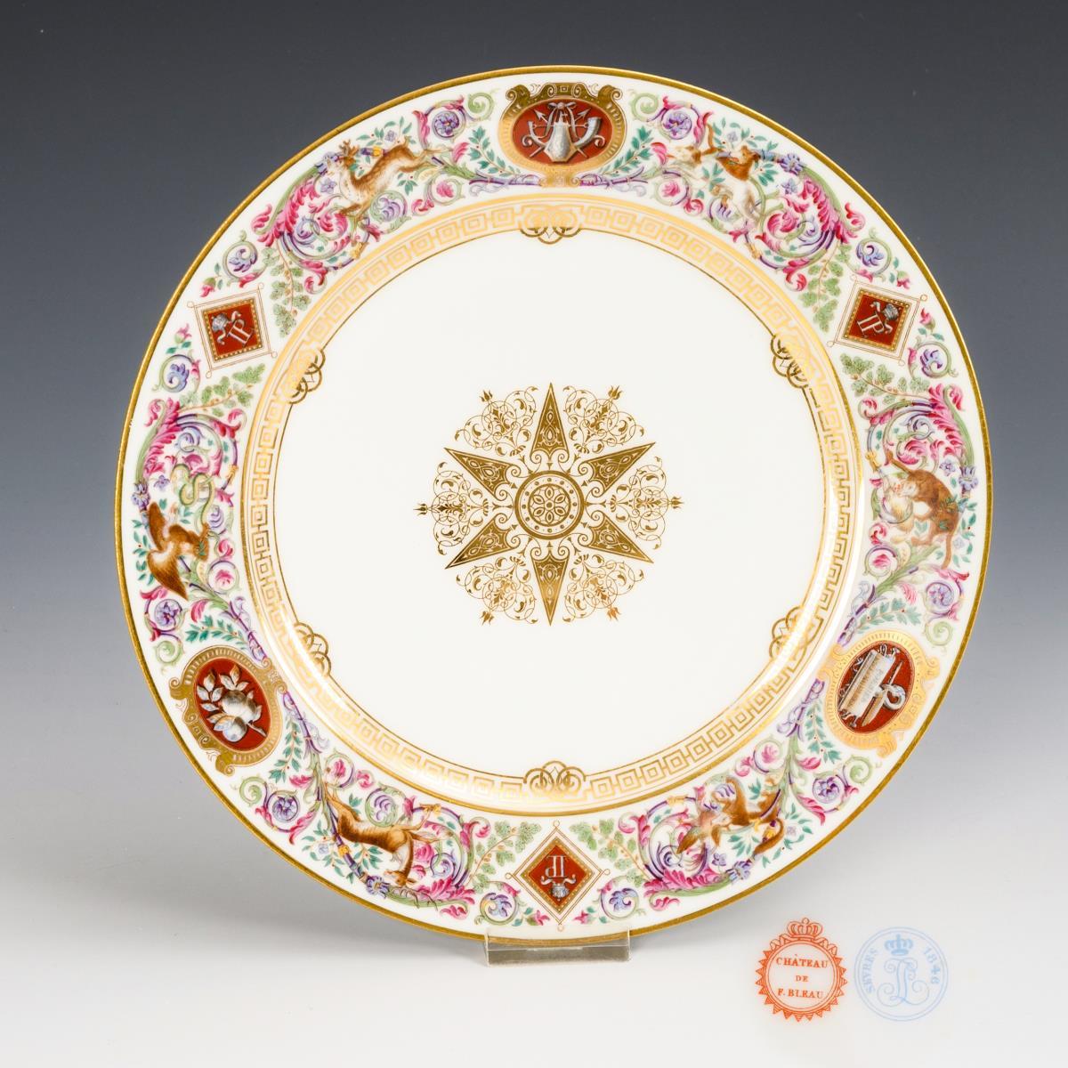 Auf der Fahne ein leuchtend farbiges Groteskendekor mit Wildtieren, Hunden, Symbolmedaillons und dem Monogramm "LP" (= Louis Philippe), im Spiegel eine goldene Rosette.