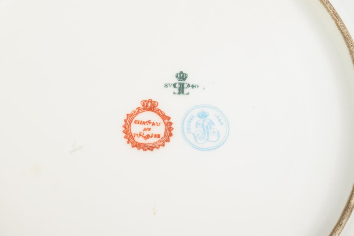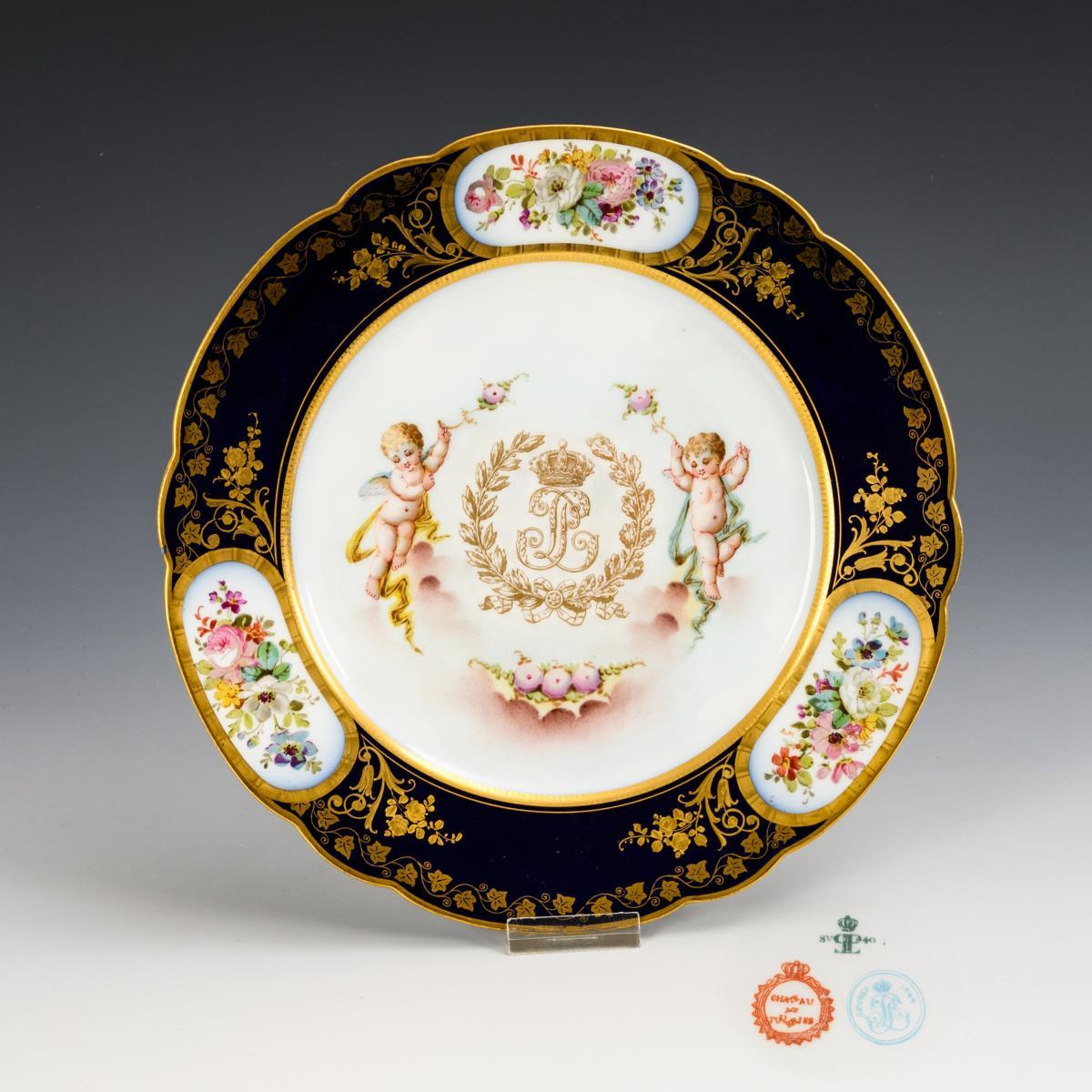 Im Spiegel das von Putten flankierte goldene Monogramm LP (= Louis Philippe), auf der kobaltblauen, floral goldgravierten Fahne drei Ovalkartuschen mit einem Blumenbukett. Minimaler Goldabrieb am Rand.
