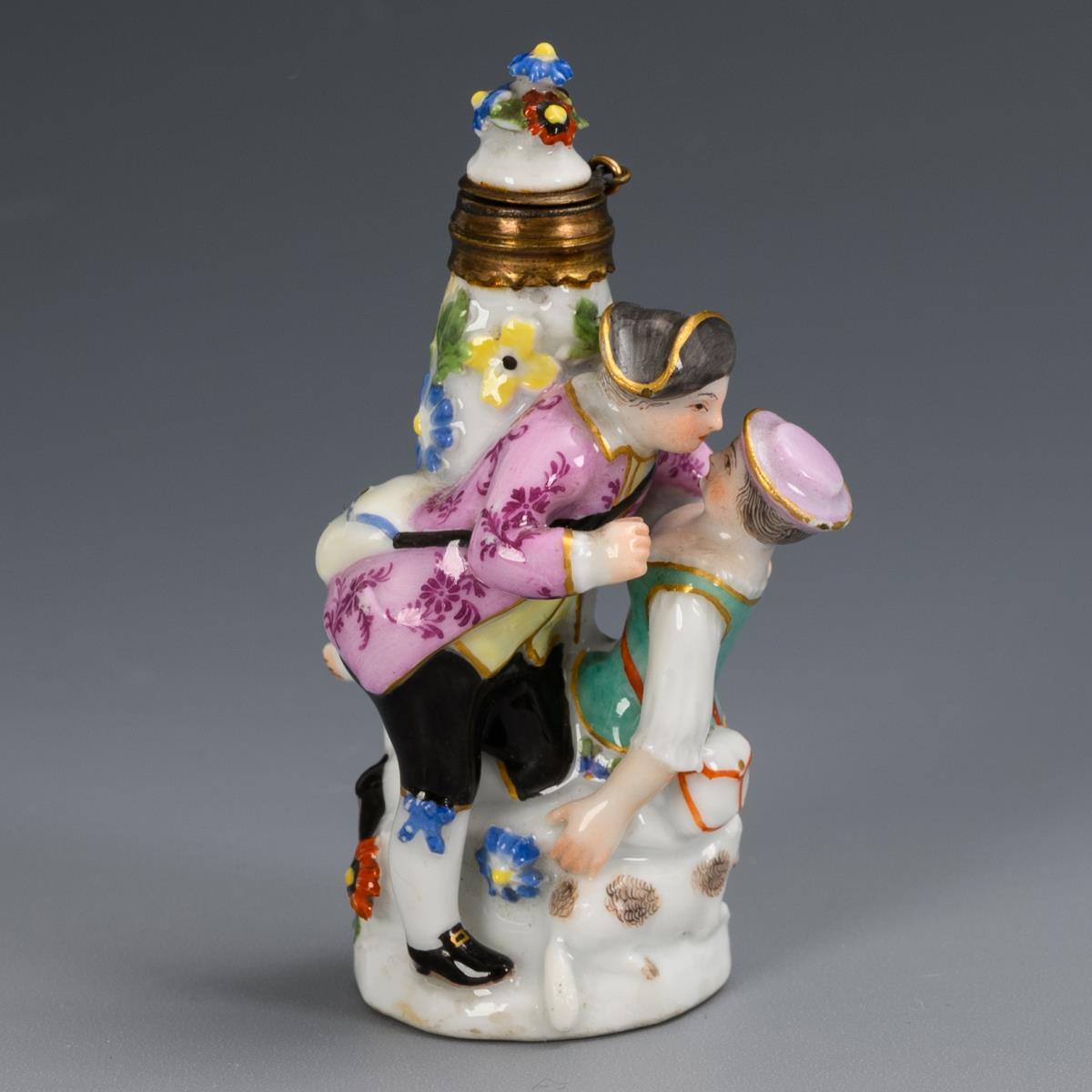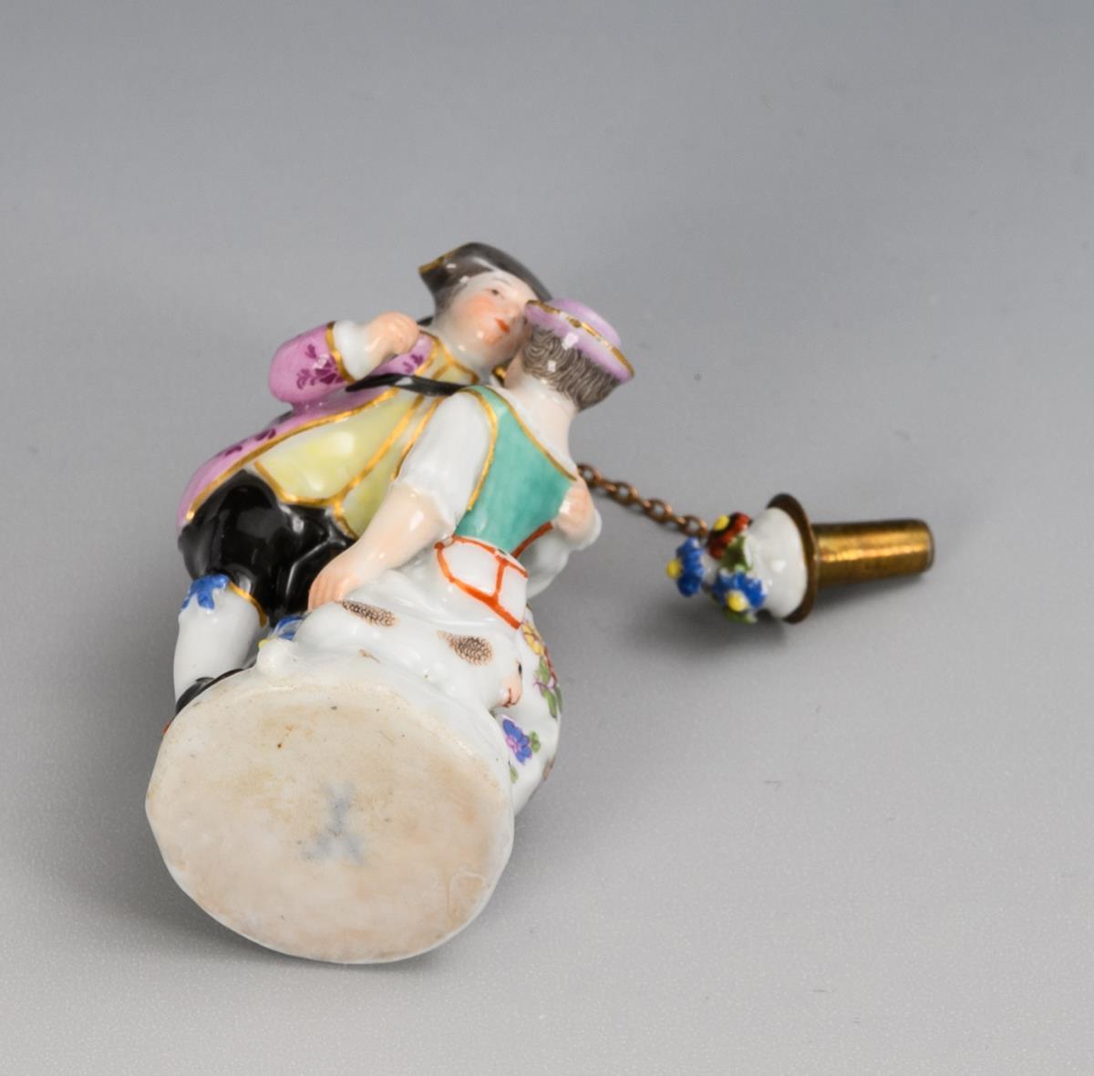 An einer blütenbelegten Säule als Flakon stehendes, sich küssendes Schäferpaar. Flakon mit Stopfen. Minimale Bestoßung am Hut des Schäfers, linker Fuß des Schäfers, Schafbein und -schwanz restauriert.