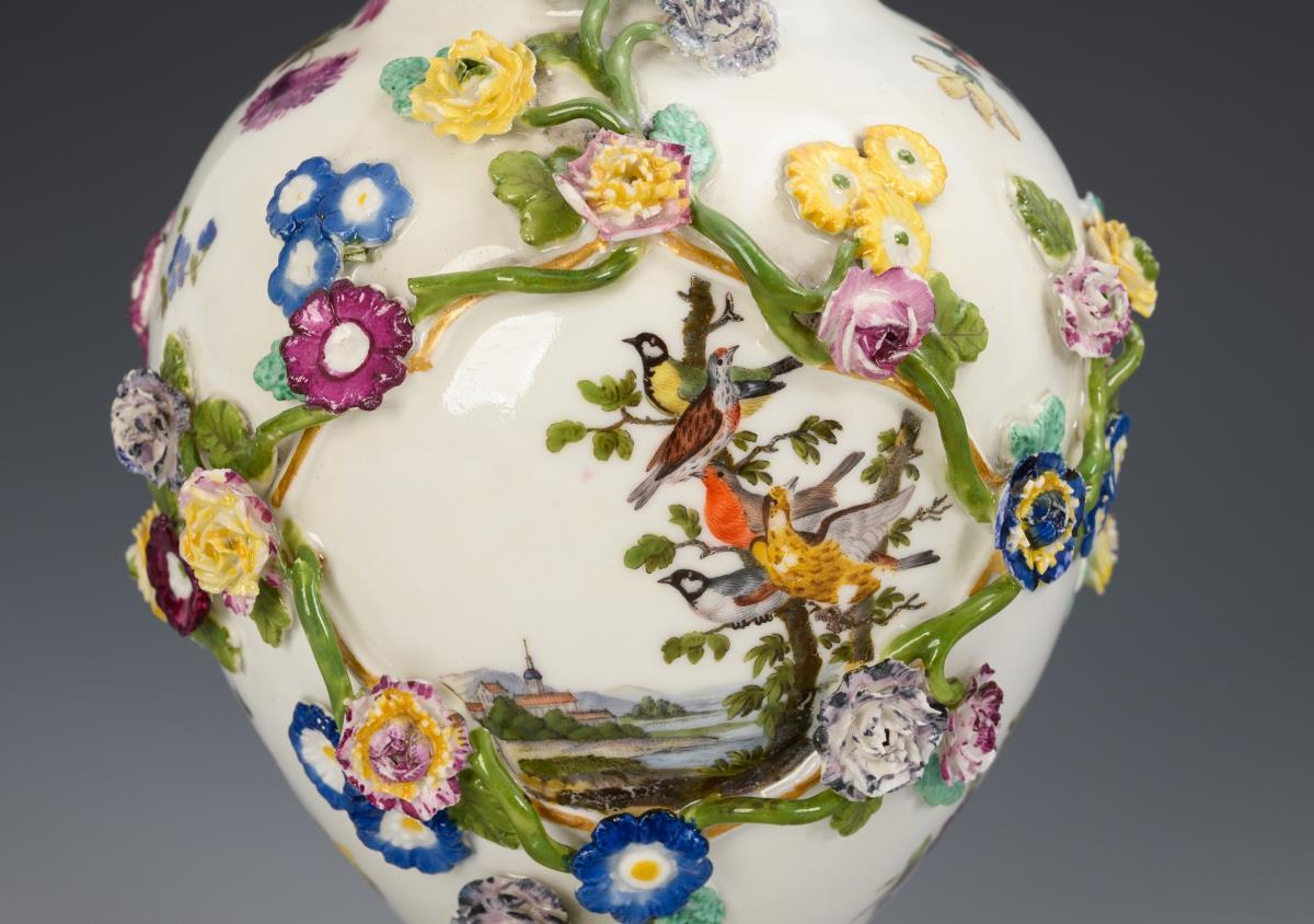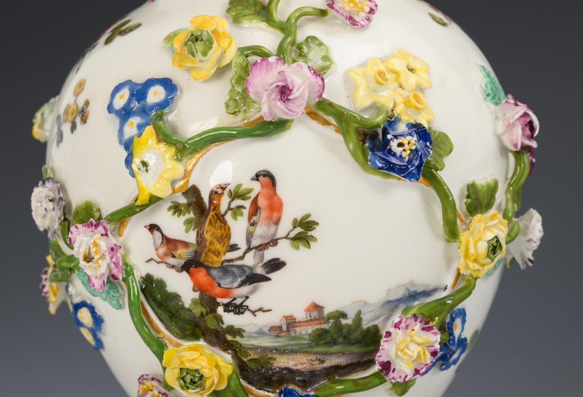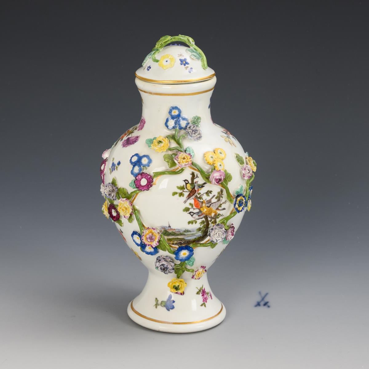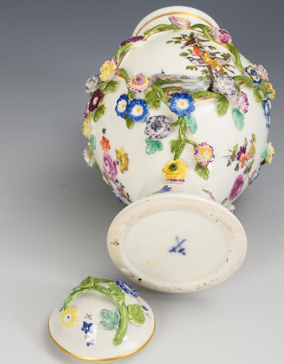 Deckelvase mit Blütenbelag, Landschafts- und Vogelmalerei. Meissen.