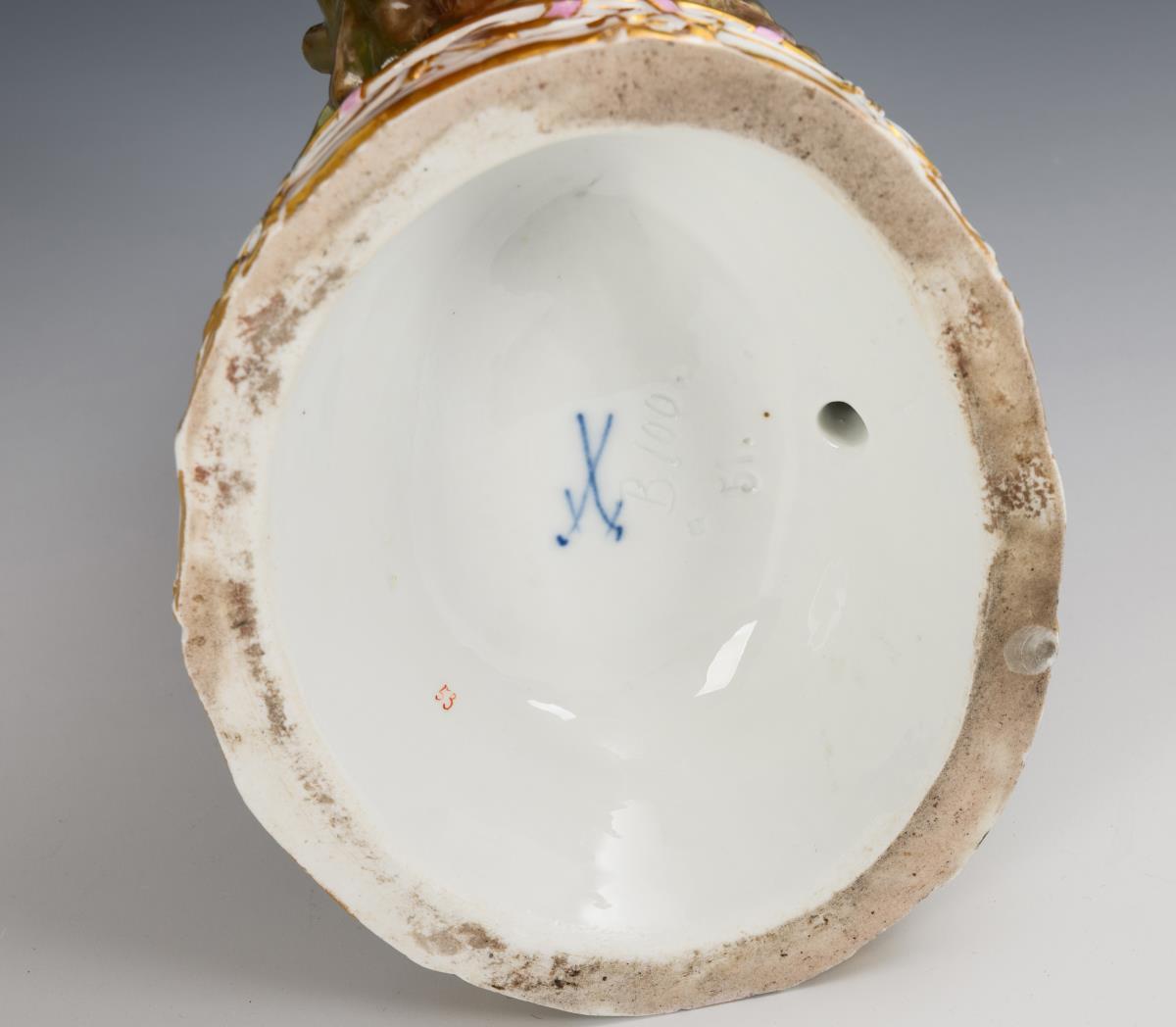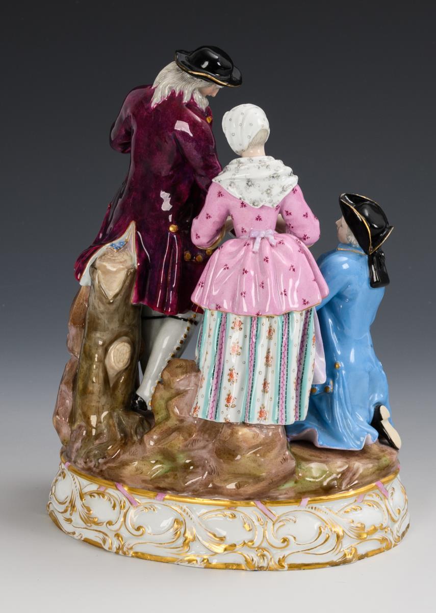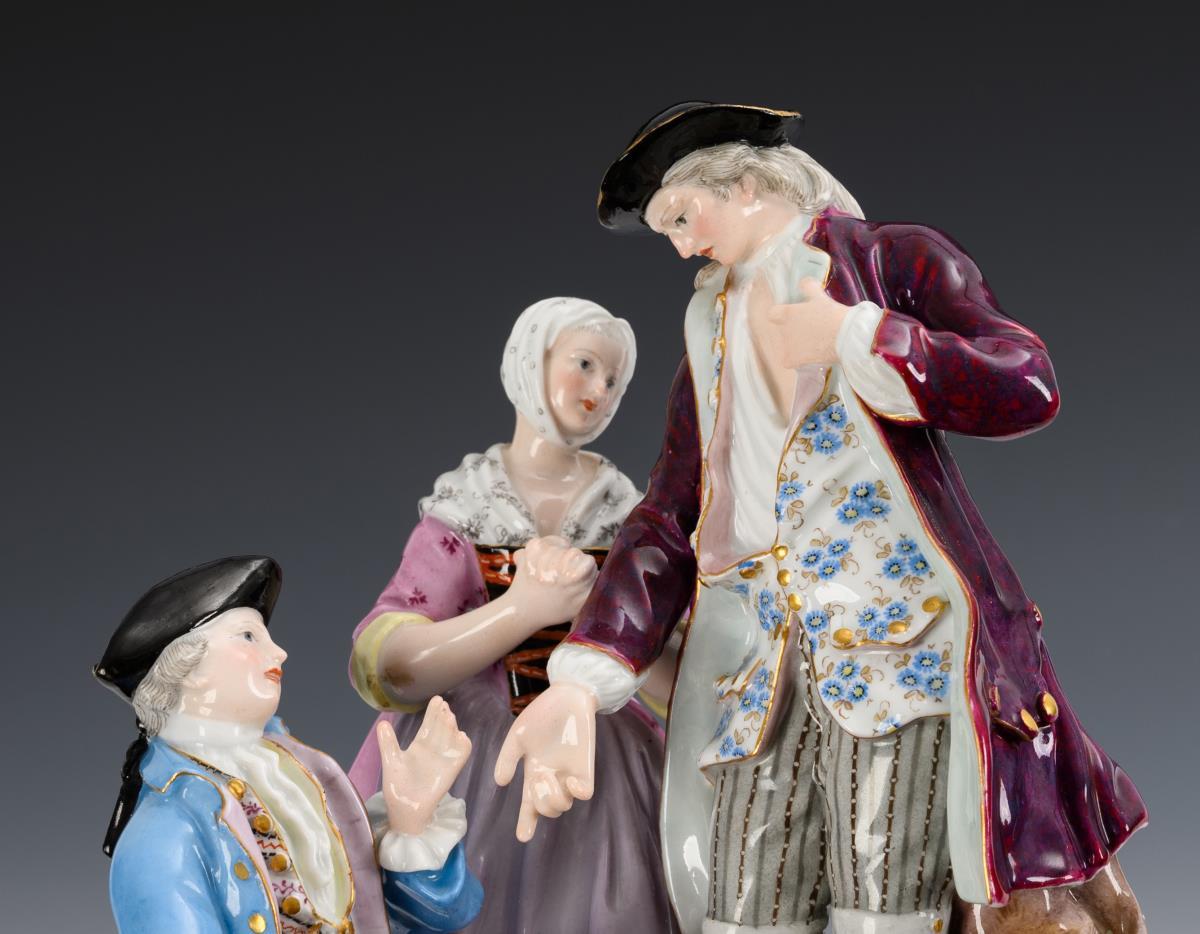 Den heimkehrenden Sohn begrüßendes Elternpaar. Unterseitig Chip am Sockelrand, Baumstumpf, Blüten und Blätter und Hut des Vaters restauriert.