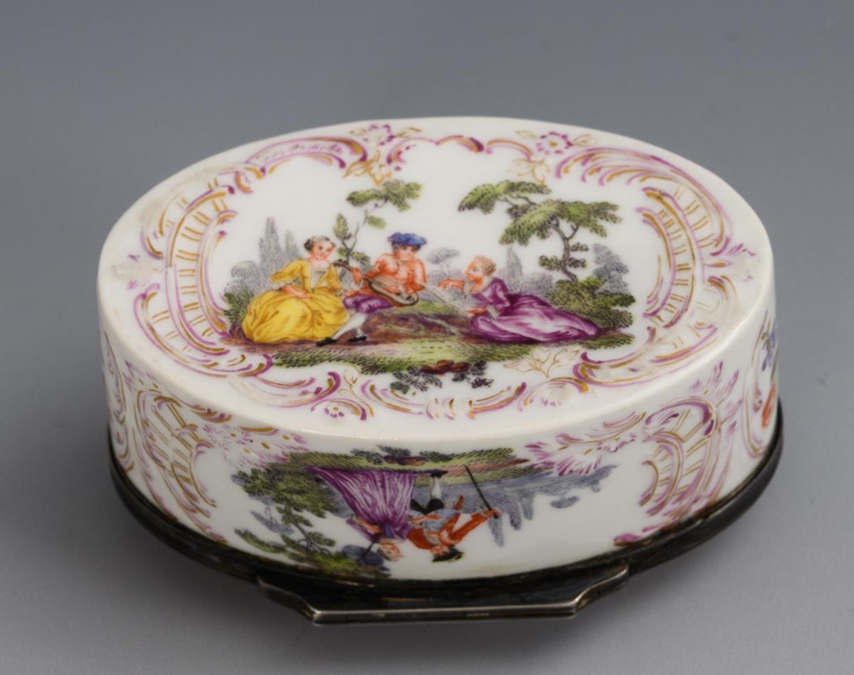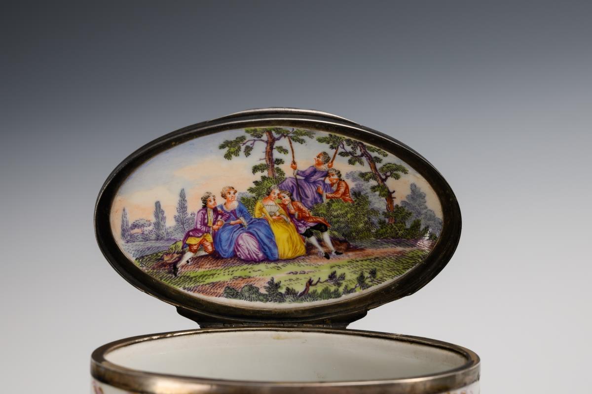 Ovale Tabatiere mit metallmontiertem Scharnierdeckel, Rocaillerelief und der Darstellung von galanten Szenen. Partieller Goldabrieb.