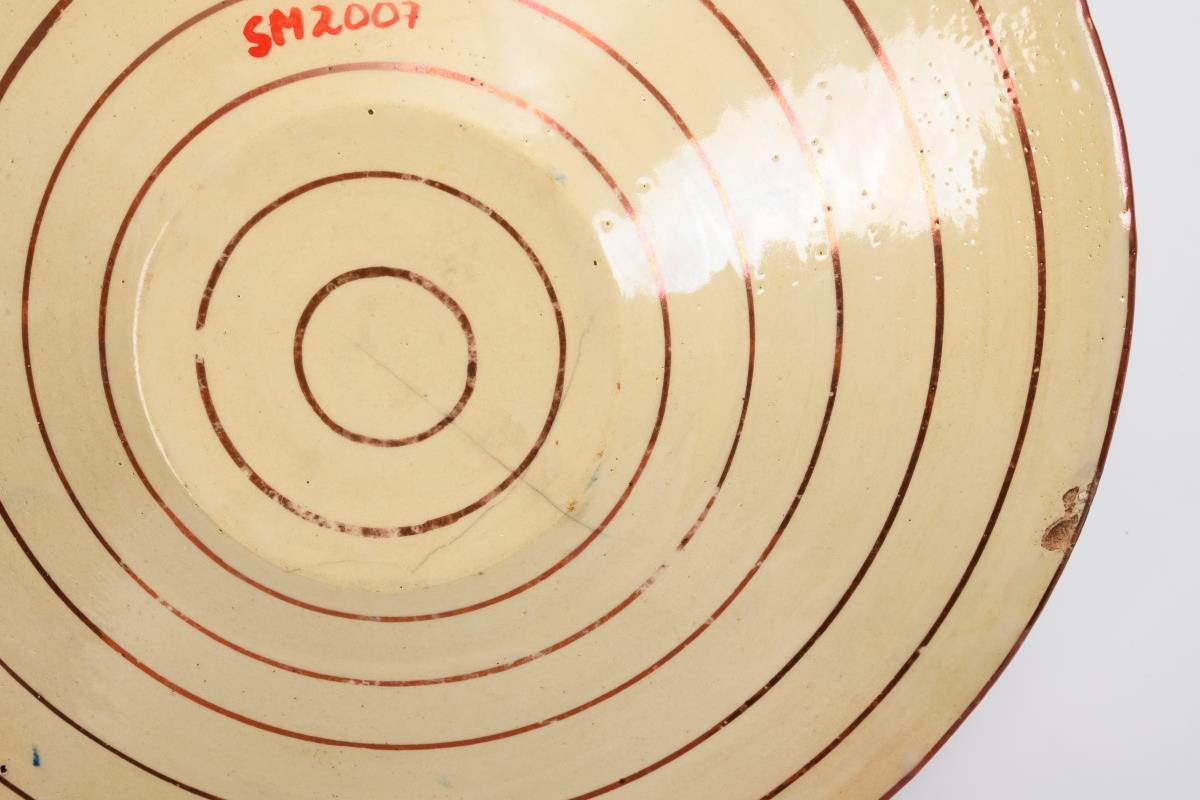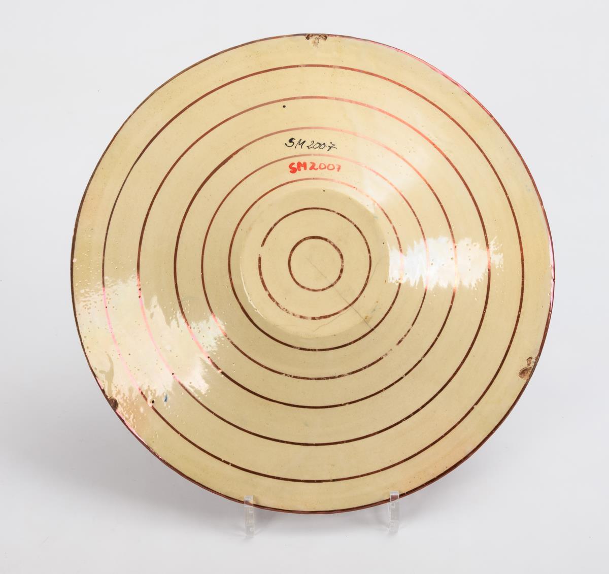 Im Stil valencianischer Spätgotik-/Renaissance-Majolika verzierter Teller mit zentralem Tiermotiv umgeben von Ringkreisen und Punkten, umlaufend die Anrufung "Ave Maria Gratia Plena" in gotischen, blauen Buchstaben. Verso konzentrische Kreise. Unterseitig am Rand leicht bestoßen, Haarrisse am Stand.