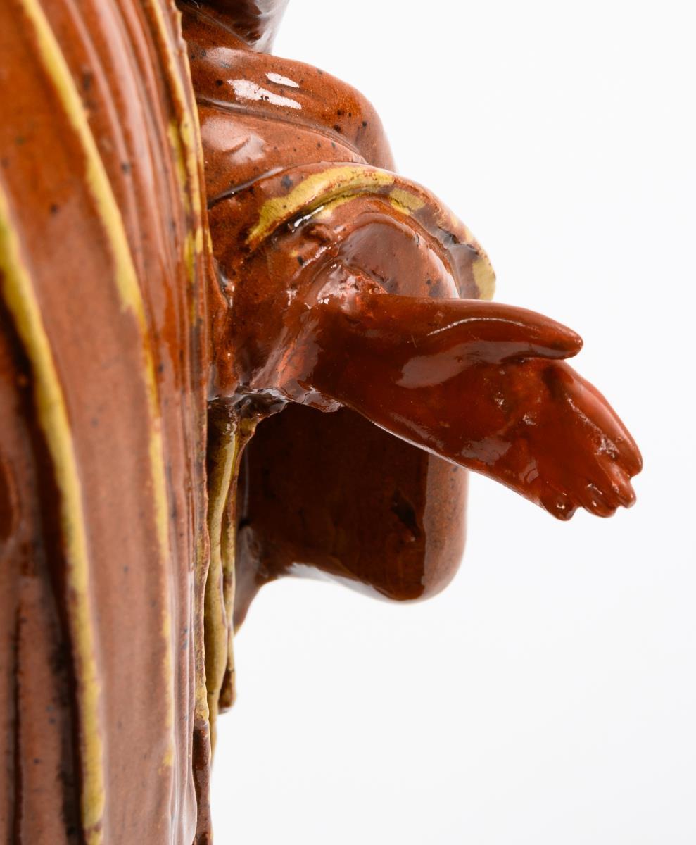 Roter Ton, braun und gelb staffiert, farblos bleiglasiert. H 49 cm.