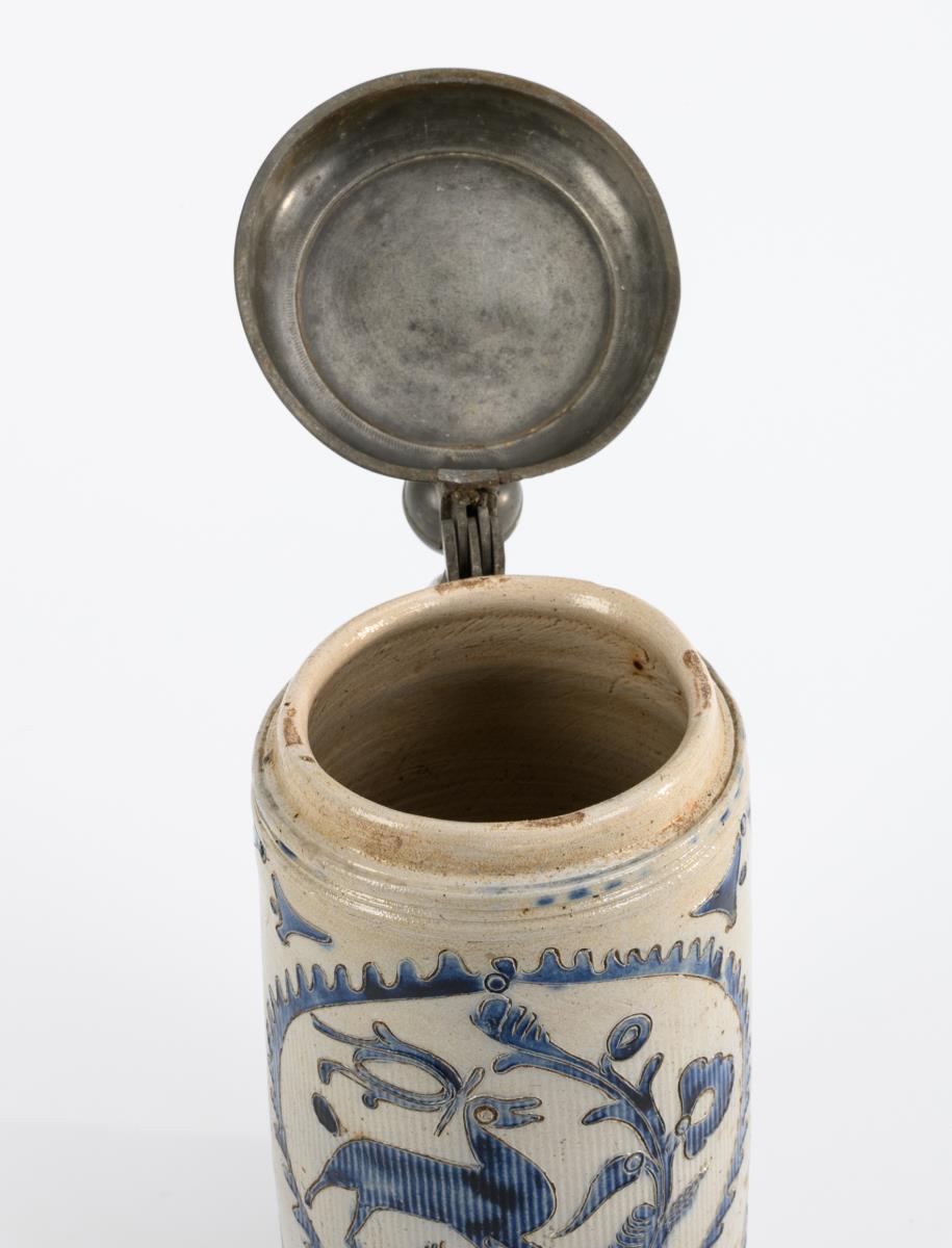 Westerwälder Walzenkrug mit Hirsch und Blattwerk.