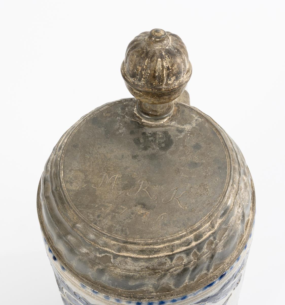 Zylinderform mit spitz auslaufendem Ohrenhenkel. Godronierter Zinndeckel mit Kugeldrücker, graviert "MRK" und datiert "1776", innen gepunzt. Altersspuren.