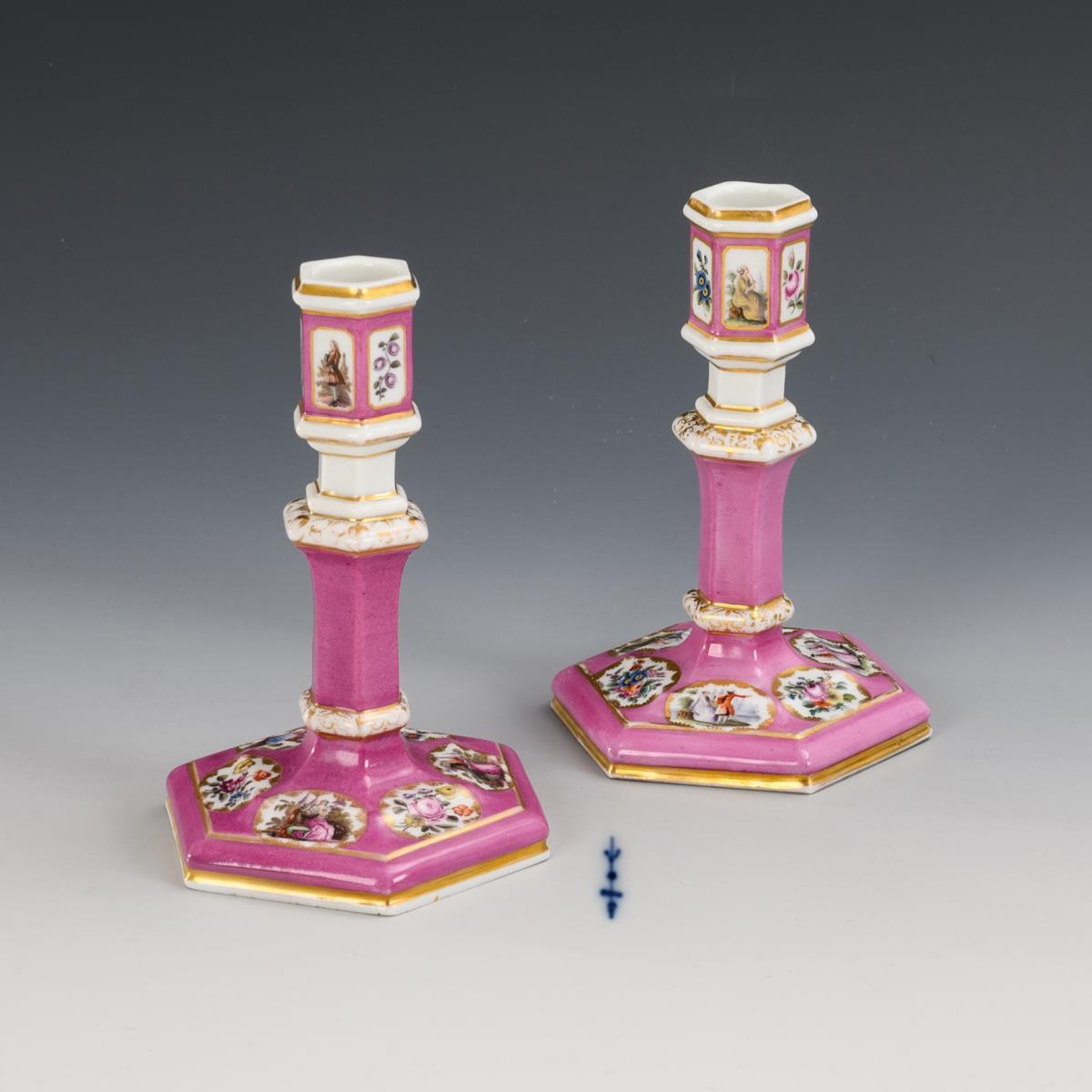 Sechseckige Leuchter mit mehrfach gegliedertem Schaft. Rosafarbener Fond, in kleinen Kartuschen galante Szenen bzw. Blumenbuketts. Minimaler Goldabrieb.