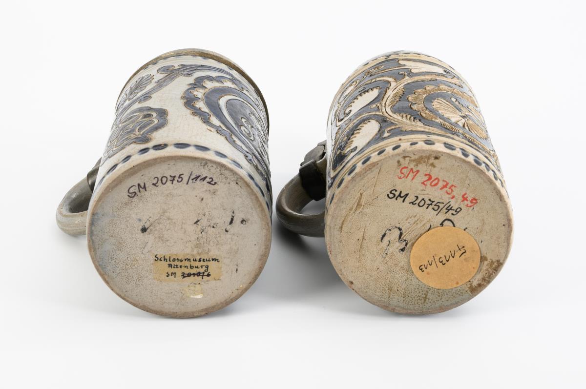 Graues, salzglasiertes Steinzeug mit Ritz- und Stempeldekor, kobaltblauer Bemalung und Pünktchenzier. H 22 und 22,5 cm.