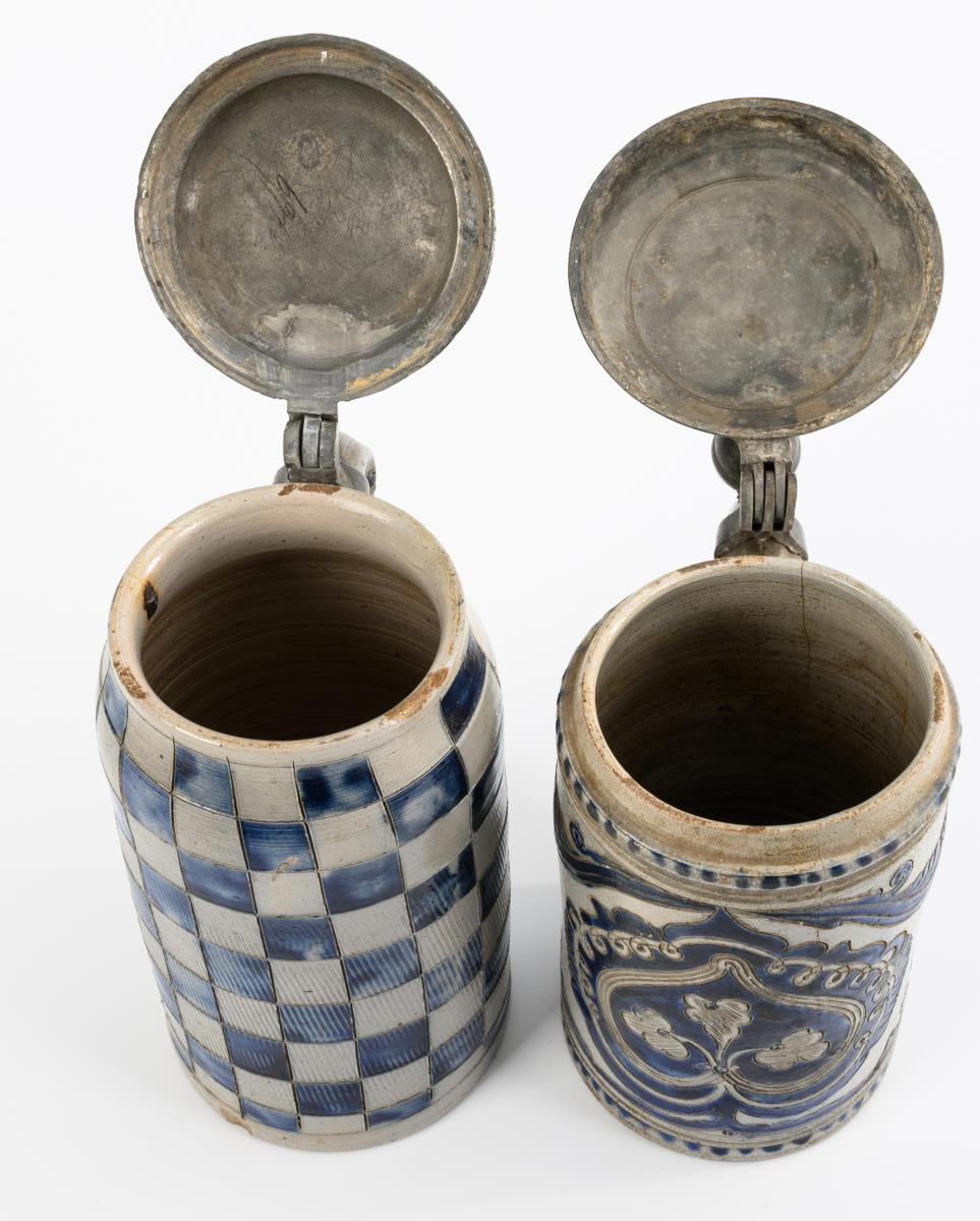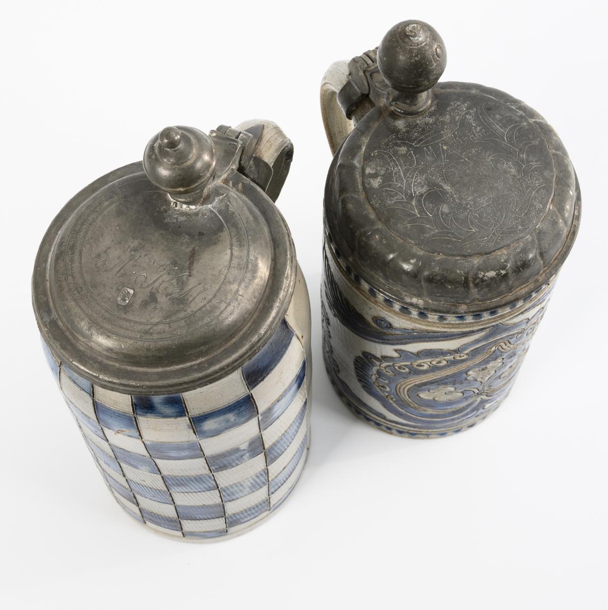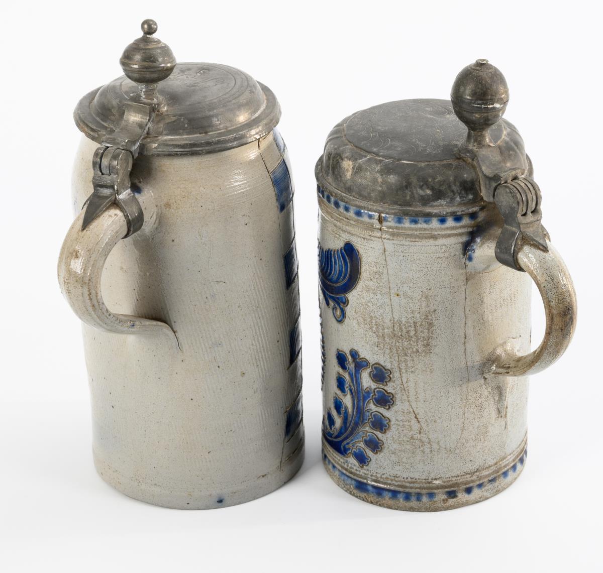 Zylinderkrug mit spitz auslaufendem Henkel, verziert mit Blumen, Blättern und Ranken, godronierter Zinndeckel mit Kugeldrücker, bekrönte Gravur und Bezeichnung "JM Knabe", datiert "1783". Schlanker Seidel mit glatt ausgestrichenem Ohrenhenkel und Schachbrettmuster, Zinndeckel mit Kugeldrücker, undeutlich graviert "JKM(?)" und punziert. Alters- und Gebrauchsspuren, partiell Defekte, 1 Krug rissig.