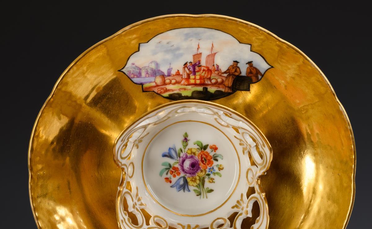 Modell "Altozier". Glockentasse mit zwei Henkeln und Knaufdeckel, Untertasse mit erhöhtem, durchbrochen gearbeitetem Standring und türkisfarbenem Außenfond. In Ovalkartuschen die Darstellung von Hafenszenen mit Segelschiffen, Kaufleuten und Warenladungen. Deckelknauf geklebt und mit Wachs (?) fixiert, kurzer Haarriss und minimaler Goldabrieb am Rand.