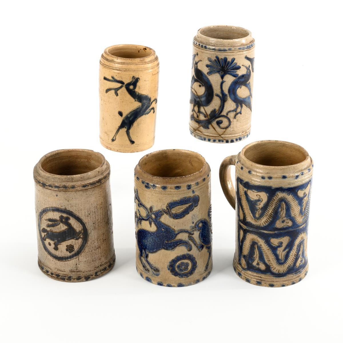 5 Westerwälder Walzenkrüge mit verschiedenen Tieren und Blumen.