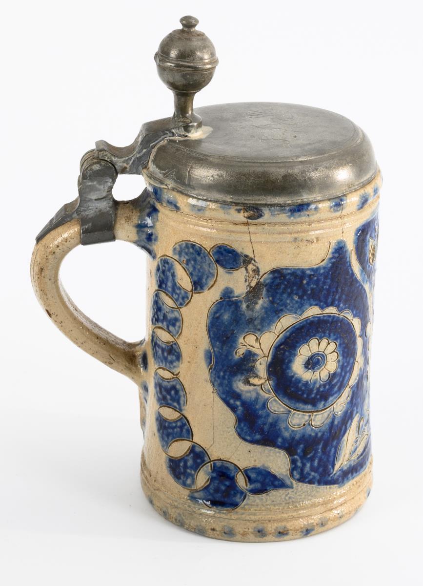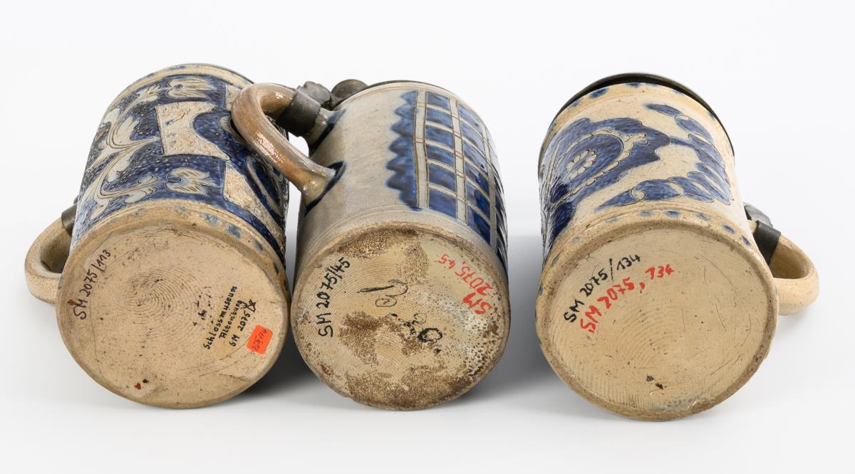 Graues, salzglasiertes Steinzeug mit Ritz-, Model- und Stempeldekor, kobaltblauer Bemalung, teils Pünktchenzier. H 19,5 bis 21 cm.